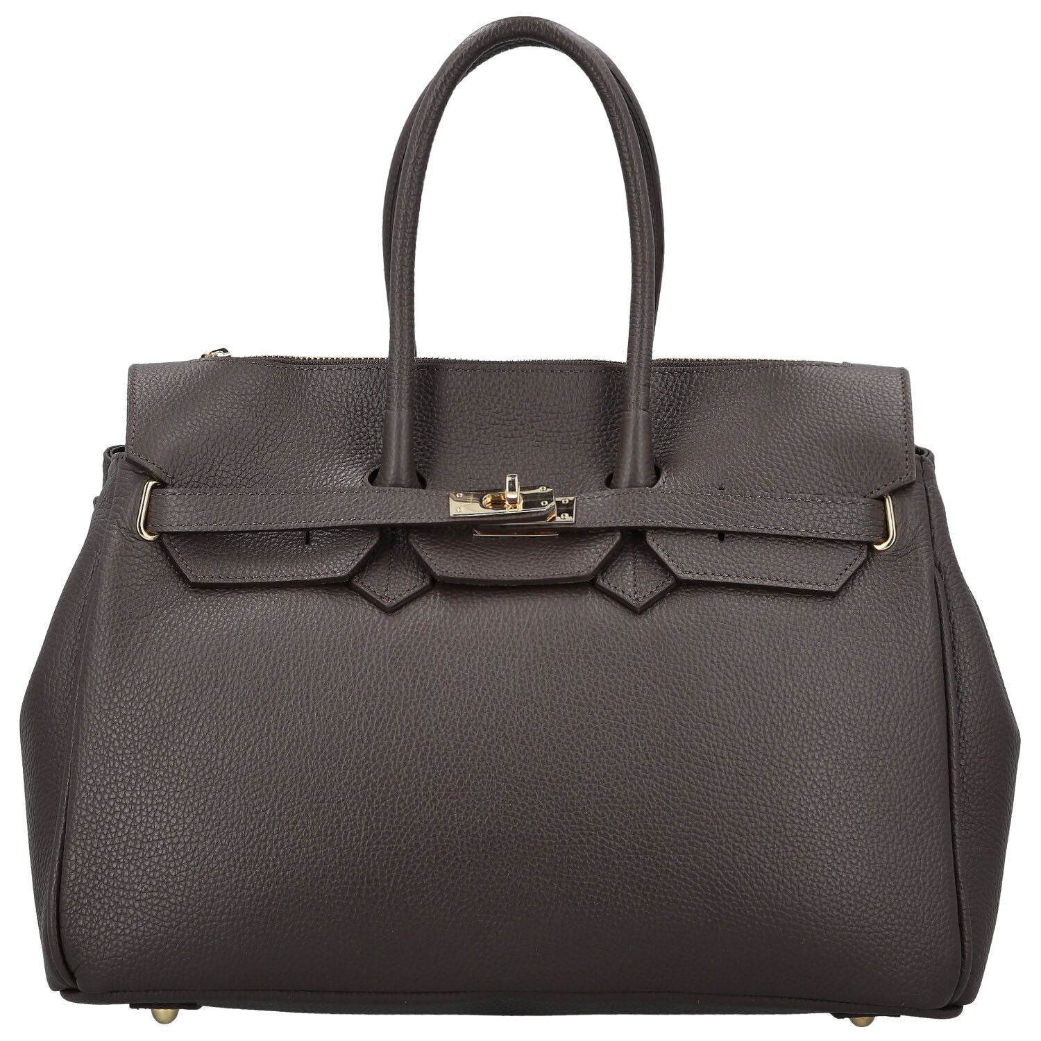 Její tvarově pevné tělo z kvalitní strukturované kůže působí sofistikovaně a nadčasově. Přední stranu zdobí stylová klopa se zlatým zámečkem, který kabelce dodává nádech exkluzivity. Praktickou vychytávkou je zip ve vrchní části, do kabelky se tak pohodlně dostanete i bez otevření klopy.