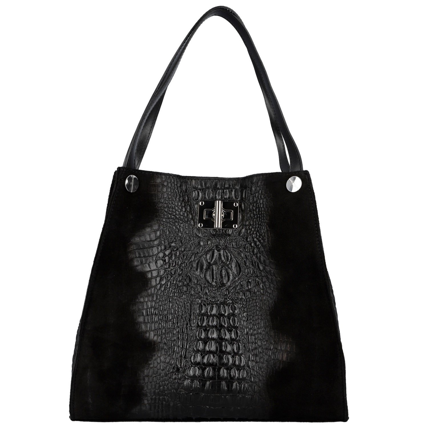 Kombinace jemně broušené kůže a lesklého krokodýlího vzoru vytváří jedinečný design, který okamžitě upoutá pohled. Pevná kožená ucha se stříbrným zakončením dodávají kabelce moderní šmrnc, zatímco hlavní kapsa je bezpečně uzavíratelná stříbrným kovovým zámečkem.