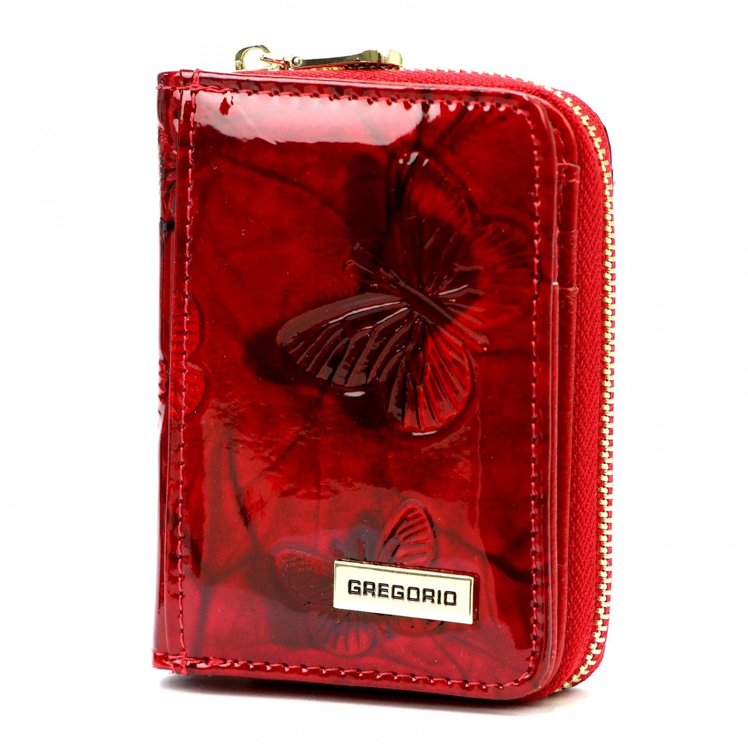 Je vyrobená z kvalitní lakované kůže s motivem motýlů, která zajišťuje dlouhou životnost a luxusní vzhled. Má moderní design s důrazem na funkčnost a bezpečnost. V přední části je logo značky. A tam se i peněženka otevře pomocí druku, uvnitř kapsičky pro karty a bankovky.
