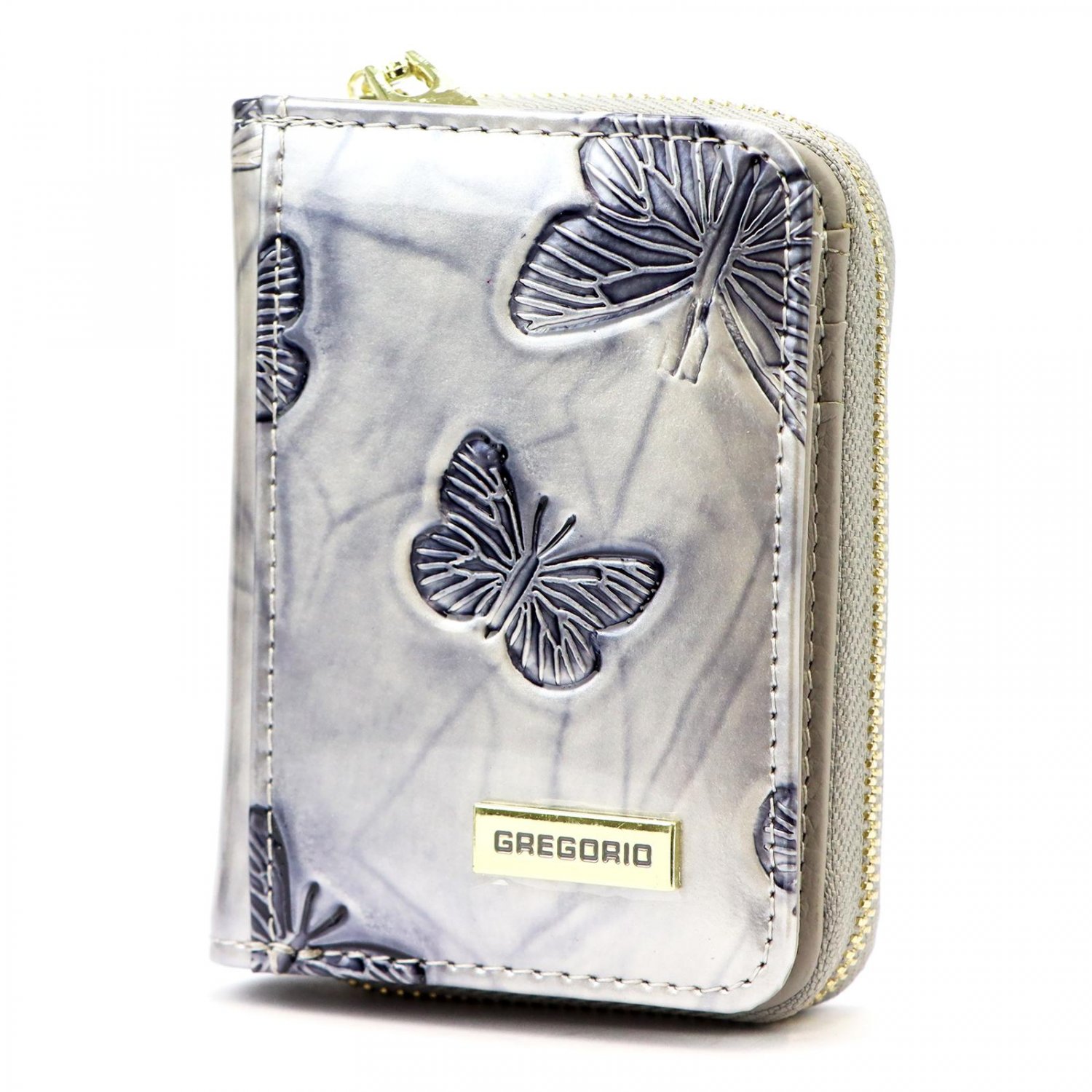 Je vyrobená z kvalitní lakované kůže s motivem motýlů, která zajišťuje dlouhou životnost a luxusní vzhled. Má moderní design s důrazem na funkčnost a bezpečnost. V přední části je logo značky. A tam se i peněženka otevře pomocí druku, uvnitř kapsičky pro karty a bankovky.