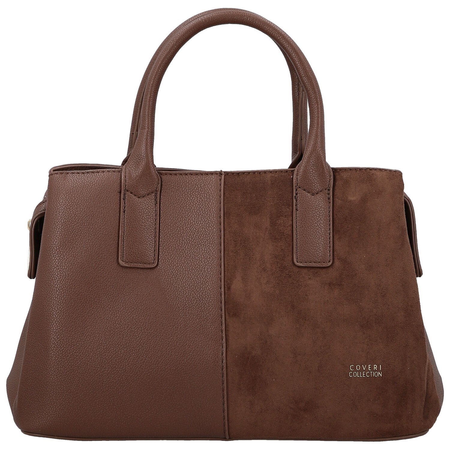 Přední strana zaujme jedinečným svislým prošitím, které dělí dva materiály - hladkou koženku a jemný semiš. Na semišové polovině je malé logo značky. Pevná koženková ucha perfektně padnou do ruky, zatímco přídavný koženkový popruh umožňuje pohodlné nošení na rameni.