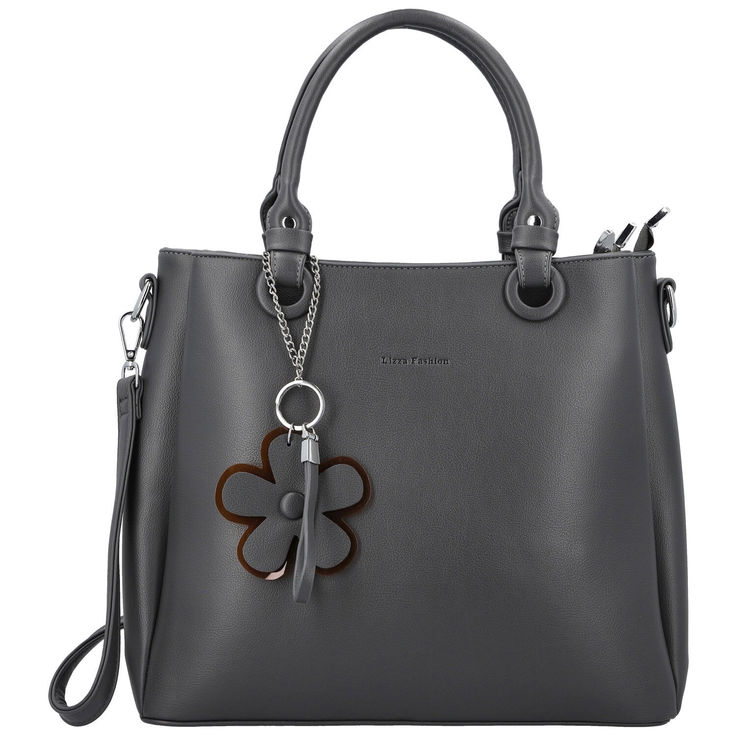 Přední stranu zdobí elegantní přívěšek v podobě květiny, jenž podtrhuje sofistikovaný design. Kabelka nabízí tři prostorné hlavní kapsy na zip se stříbrným kováním a uvnitř praktické kapsičky v podšívce pro perfektní organizaci drobností.