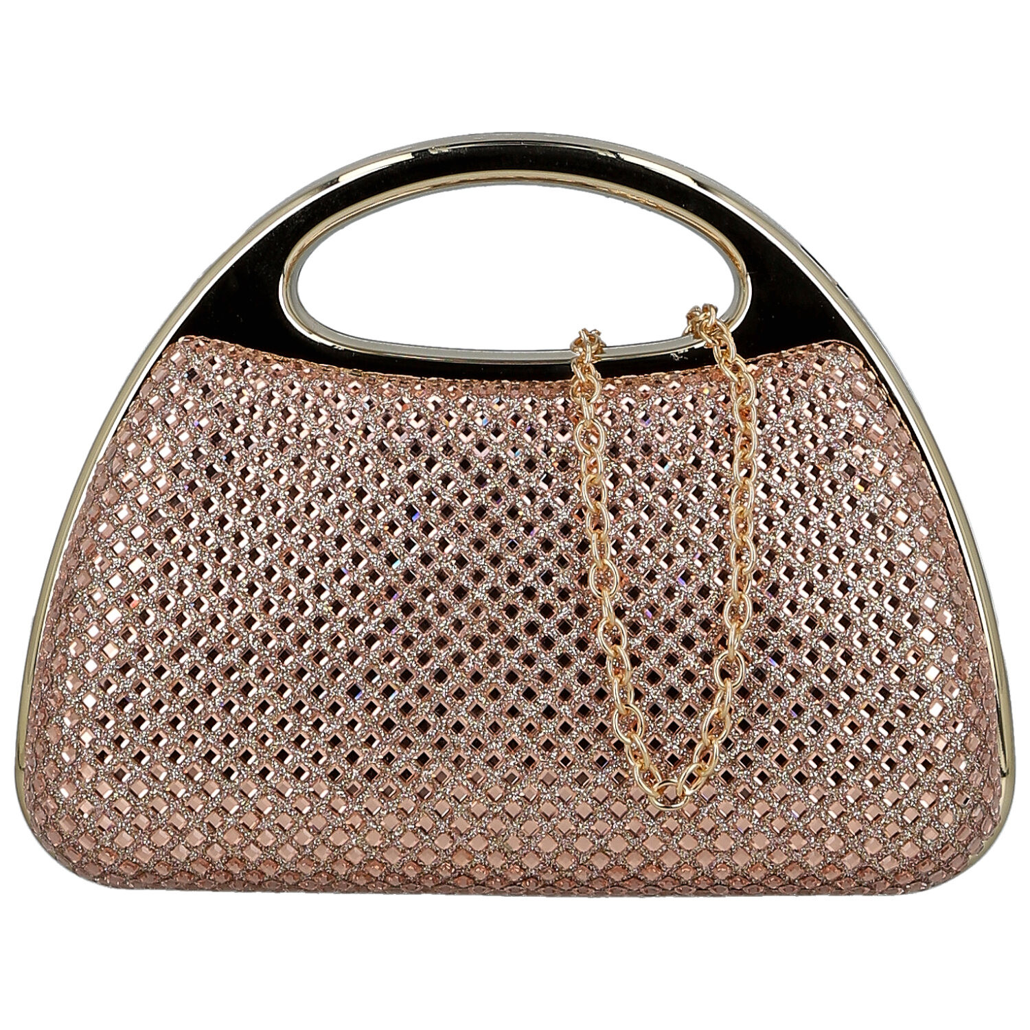 Pevné kovové ucho slouží zároveň jako praktické otevírání a dodává kabelce sofistikovaný tvar. Celý povrch je potažen třpytivou síťkou, která vytváří efekt jemně třpytivých kamínků - dokonalý detail pro zářivé večerní outfity.