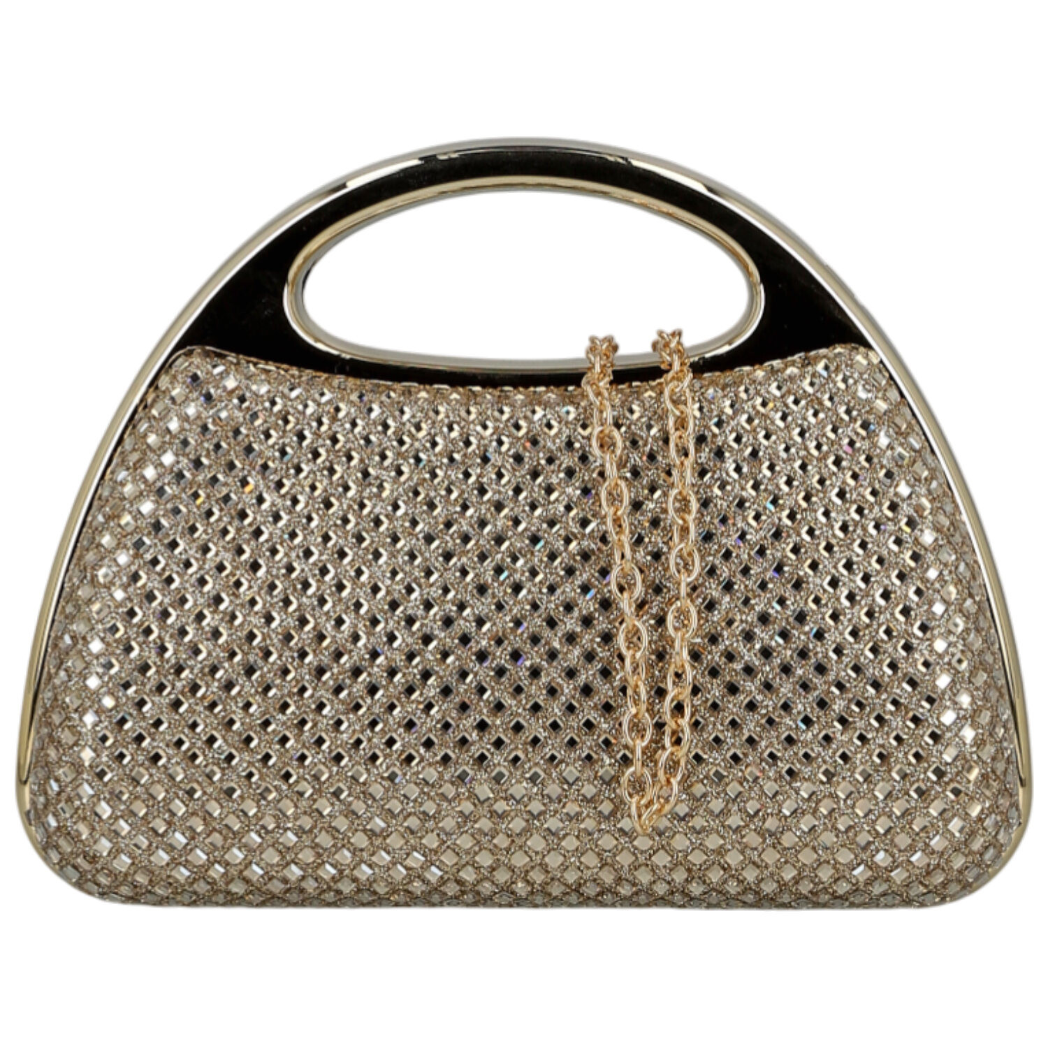 Pevné kovové ucho slouží zároveň jako praktické otevírání a dodává kabelce sofistikovaný tvar. Celý povrch je potažen třpytivou síťkou, která vytváří efekt jemně třpytivých kamínků - dokonalý detail pro zářivé večerní outfity.
