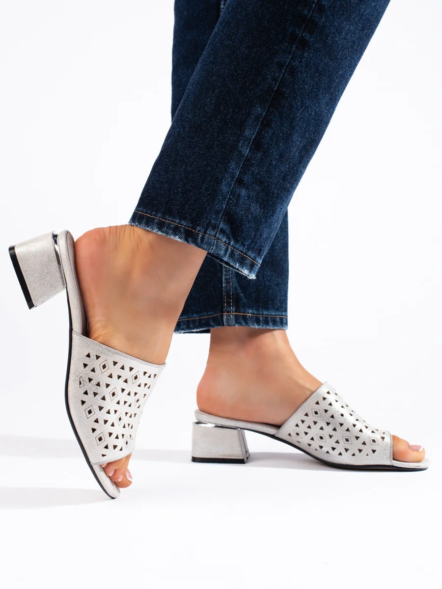 Luxusní dámské nazouváky stříbrné na širokém podpatku 38