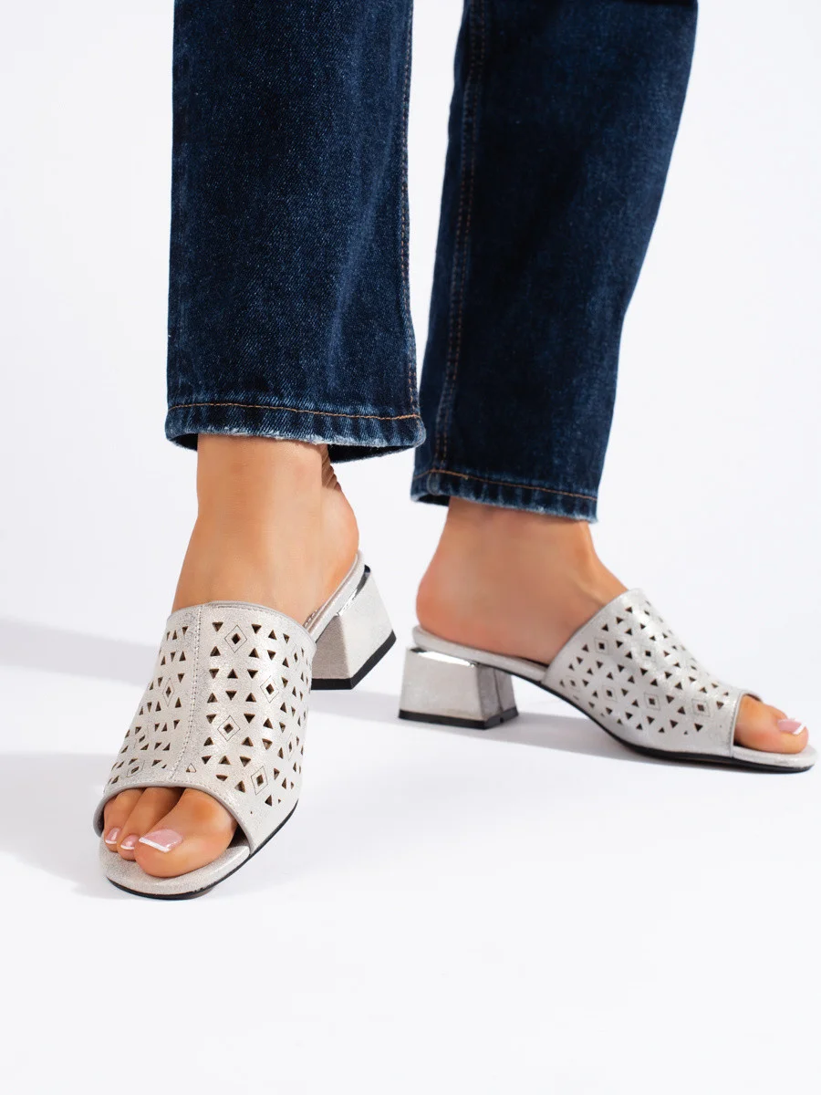 Luxusní dámské nazouváky stříbrné na širokém podpatku 39