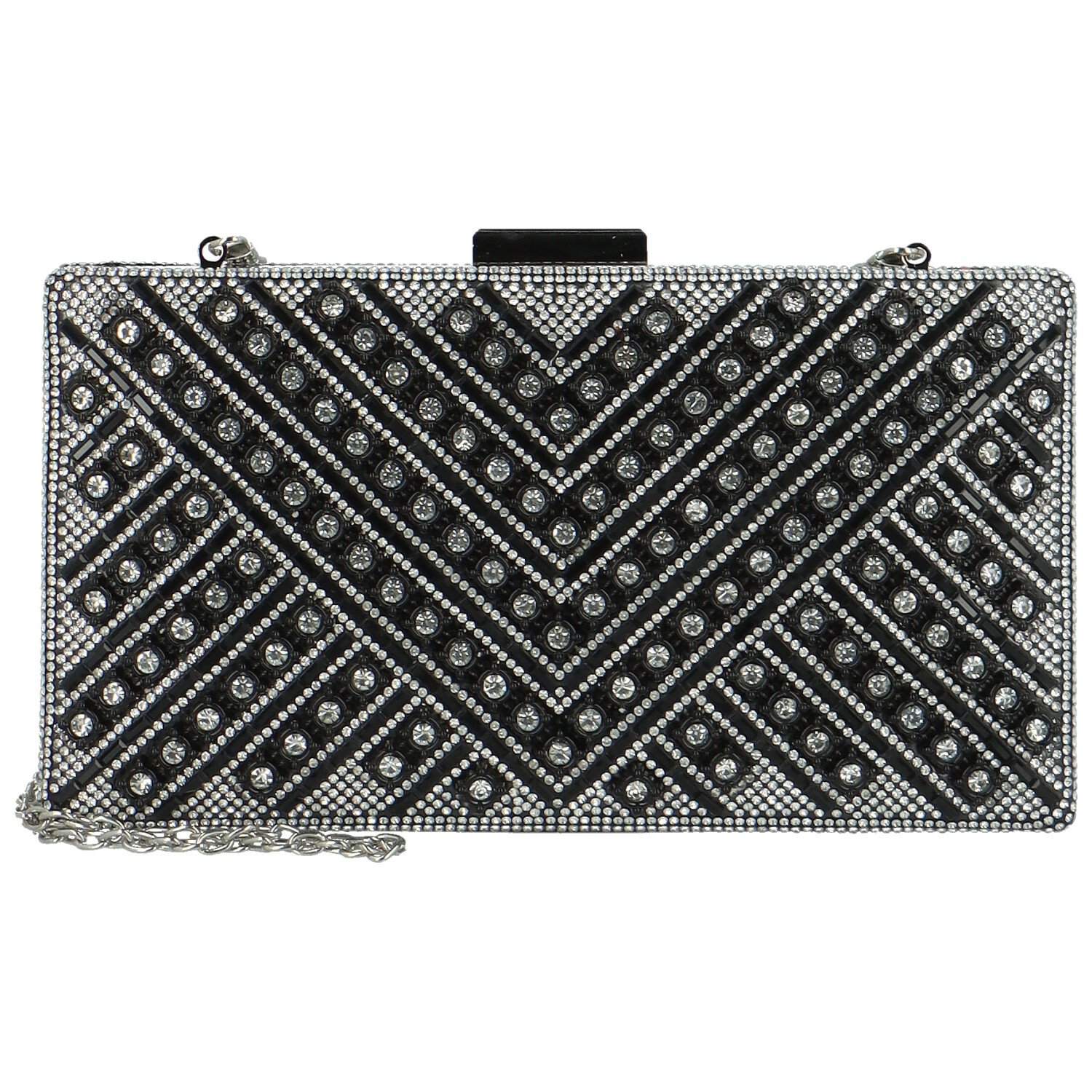 Má pevnou strukturu a je zdobené třpytivými kamínky. Vzor se skládá s diagonálních linií, které vytvářejí geometrický design. Kabelka se otevírá v kovovém rámečku s kovovým uzávěrem.