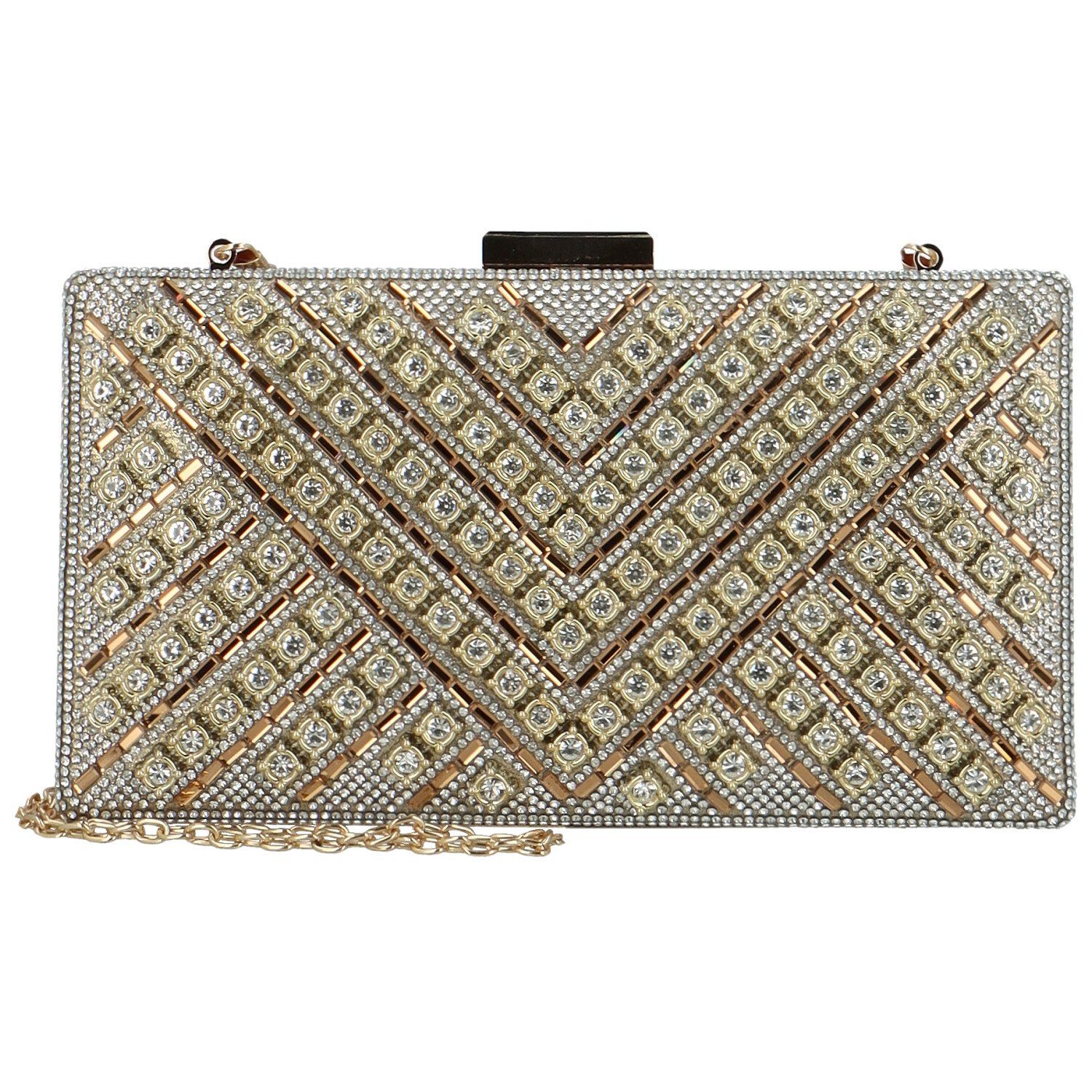 Má pevnou strukturu a je zdobené třpytivými kamínky. Vzor se skládá s diagonálních linií, které vytvářejí geometrický design. Kabelka se otevírá v kovovém rámečku s kovovým uzávěrem.