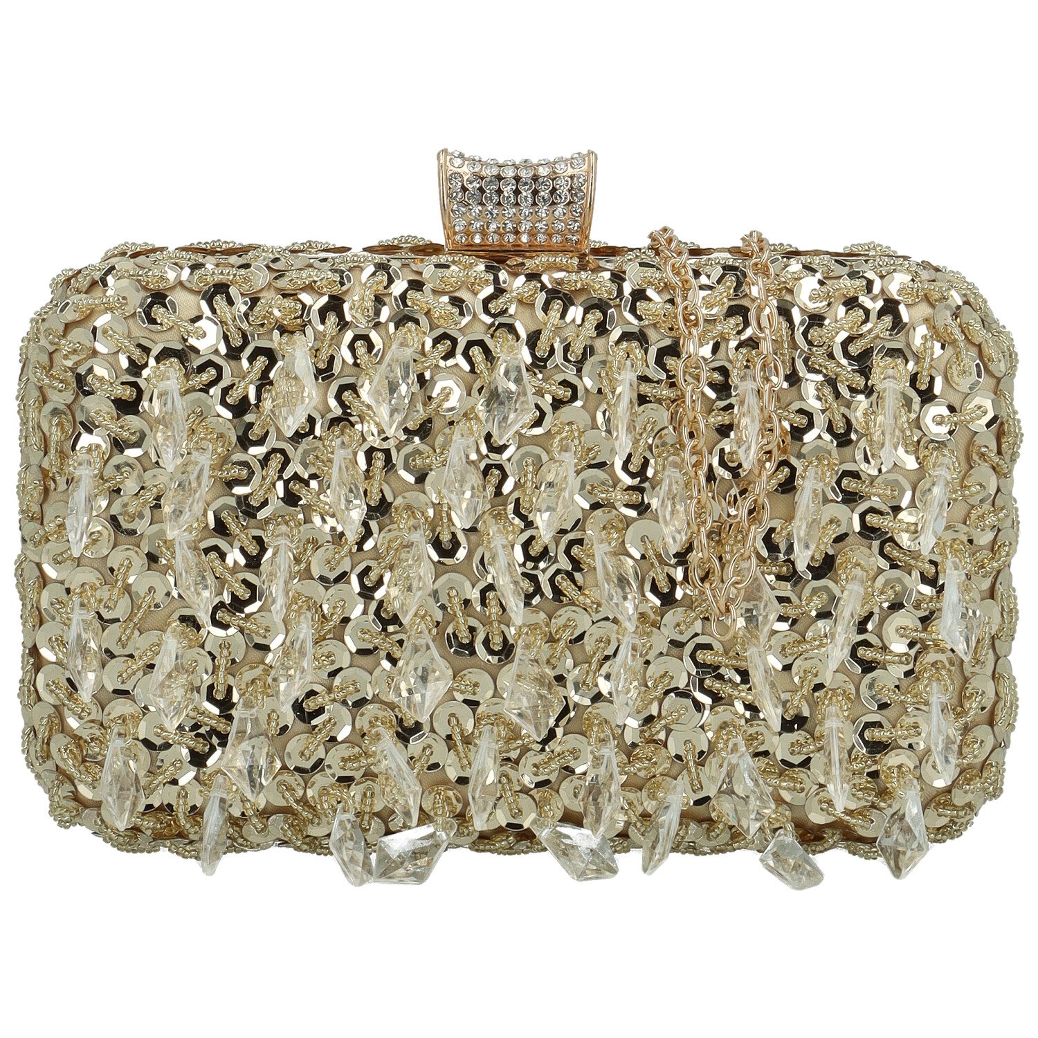 Toto okouzlující psaníčko je skutečným šperkem mezi večerními doplňky. Jeho pevná konstrukce je zcela pokryta lesklými flitry a skleněnými kamínky, které vytvářejí bohatý, texturovaný efekt a zajišťují, že v davu rozhodně nezaniknete.