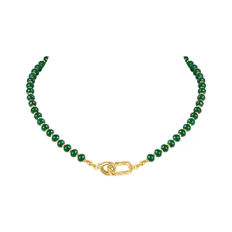 Z naší autorské kolekce Summer Symphony přichází tento exkluzivní korálkový náhrdelník, který je nepostradatelným doplňkem pro každou letní šatní skříň. Náhrdelník Isidora se pyšní řadou lesklých zelených achátů, které jsou známé svou schopností přinášet rovnováhu a harmonii. Jejich bohatý zelený odstín evokuje klidnou atmosféru lesních scenérií a dodává každému vzhledu nádech přírodní elegance. Zelené acháty jsou ceněny nejen pro svou estetickou krásu, ale i pro své uklidňující vlastnosti. Věří se, že podporují duševní pohodu a jsou symbolem emocionální rovnováhy, což je činí ideálním doplňkem k letní relaxaci u moře nebo při večerních procházkách po pláži. Tento náhrdelník tak není jen módním statementem, ale také posiluje pocit vnitřního klidu a spokojenosti. Kombinace zelené a zlaté barvy navíc skvěle doplňuje letní outfity, ať už jde o ležérní bílé šaty nebo elegantní večerní oděv. Náhrdelník je rovněž ideální pro vrstvení s dalšími šperky z naší kolekce, jako jsou ocelové řetízky s přívěsky, což umožňuje vytvoření osobitého a stylového vzhledu. Nabízí se jako výjimečný dárek pro milovníky módy, kteří chtějí svému letnímu šatníku přidat kousek s hlubším významem.