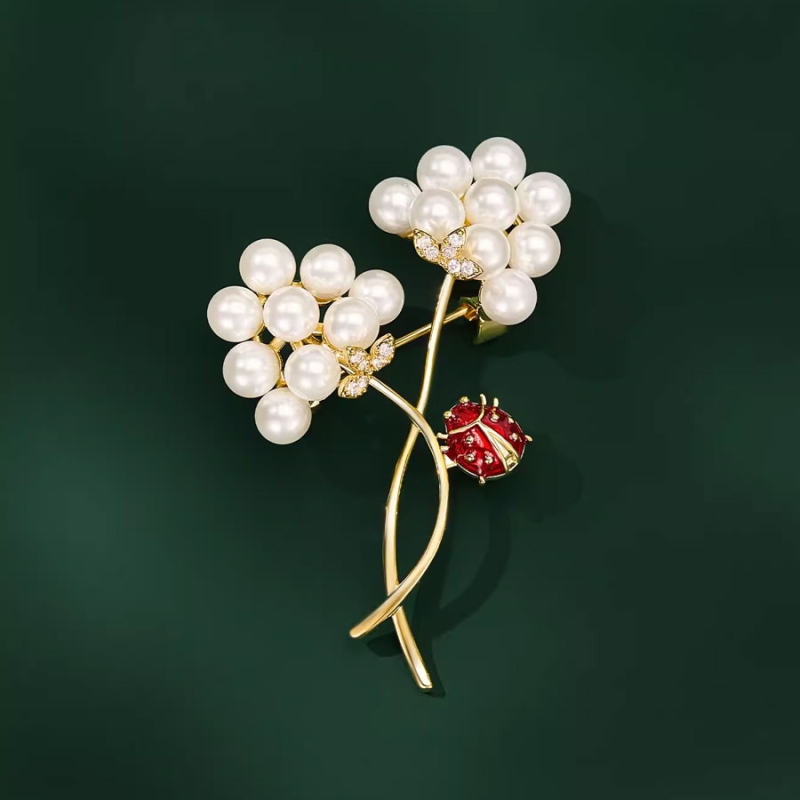 Tato okouzlující brož představuje dva rozkvetlé květy z lesklých perel, které působí jako něžné pohlazení přírody. Každý detail je precizně zpracován – od zlatavých stonků až po drobné třpytivé lístky, které dodávají šperku nádech luxusu a jemnosti.Neodolatelným akcentem je červená beruška – symbol štěstí, radosti a hravosti. Její sytý červený odstín vytváří nádherný kontrast k perlové bílé a jemnému zlatu, čímž celý šperk získává výjimečný a nezapomenutelný charakter.Brož skvěle vynikne na saku, kabátu, šatech i halence. Je ideálním doplňkem pro každou ženu, která miluje originální detaily, přirozenou krásu a špetku poetiky. Působí elegantně i vesele zároveň – a právě tím je výjimečná. 💡 Tip: Brož potěší jako promyšlený dárek pro maminku, partnerku nebo blízkou přítelkyni – symbolika květin a berušky působí hřejivě a osobně.