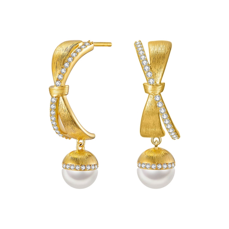 Elegantní visací náušnice z autorské kolekce Barvy podzimu jsou ztělesněním ženskosti, vkusu a noblesy. Základ tvoří tvarovaný zlatý prvek s jemnou strukturou připomínající hedvábný lesk listů, který je osazen precizně broušenými zirkony. Spodní část zdobí dokonale kulatá perla, jež dodává celému designu vyváženost a nadčasovou eleganci.Každý detail těchto náušnic byl vytvořen s důrazem na kvalitu i estetiku – od antialergického stříbrného dříku 925/1000 až po jemný lesk zirkonové linie, která ladně obepíná tvar mašle. Výsledkem je harmonická kompozice, která působí výjimečně jak při denním nošení, tak při slavnostních příležitostech.Spojení perly a zlata odkazuje na teplo podzimních tónů a decentní luxus. Tyto náušnice dokonale doplní elegantní halenku i večerní šaty, zvýrazní ladnost pohybu a přidají celkovému vzhledu sofistikovaný dojem. 💡 Tip: Darujte je ženě, která si zaslouží cítit se výjimečně. Náušnice s perlou a zirkony jsou ideálním dárkem pro narozeniny, výročí i slavnostní chvíle.