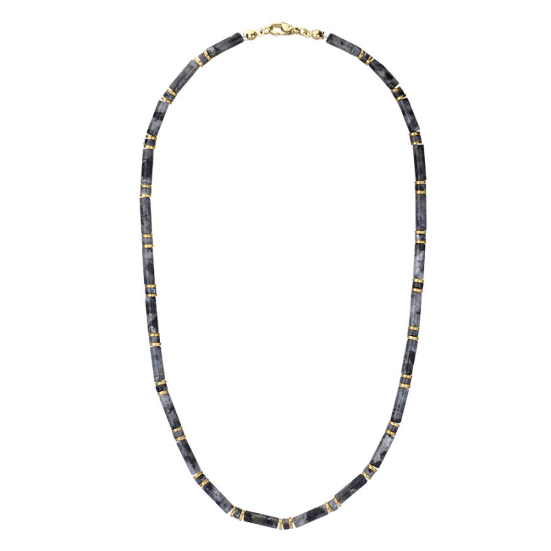 Nadčasová elegance, síla přírody a dokonalé zpracování – to vše spojuje tento pánský náhrdelník z larvikitu a pozlacených hematitových prvků. Působivá šedá barva larvikitu s přirozenými nerovnostmi v kresbě dává každému kusu jedinečný charakter. Kámen působí decentně, ale zároveň výrazně, čímž vytváří základ pro stylový doplněk s moderním nádechem.Zlaté prstence z hematitu vnášejí do kompozice luxusní akcent a podtrhují pánský šperk noblesou. Kombinace přírodních materiálů a zlatých detailů působí harmonicky a vynikne jak ve spojení s každodenním outfitem, tak i při slavnostnější příležitosti. Larvikit je známý jako kámen duševní síly, kreativity a koncentrace. Mnozí jej vyhledávají pro jeho schopnost uzemnit mysl, uklidnit emoce a podpořit schopnost soustředění. Díky těmto vlastnostem je tento šperk nejen estetickým doplňkem, ale i osobním talismanem v každodenním životě. 💡 Tip: Náhrdelník krásně ladí s bílým nebo černým tričkem, ale neztratí se ani pod otevřenou košilí – zkuste ho kombinovat s dalšími náramky ve stejném tónu a vytvořte si svůj osobitý styl. K tomuto náhrdelníku si můžete pořídit i ladící náramek a vytvořit tak dokonale sladěný a stylový look. Náramek zakoupíte ZDE