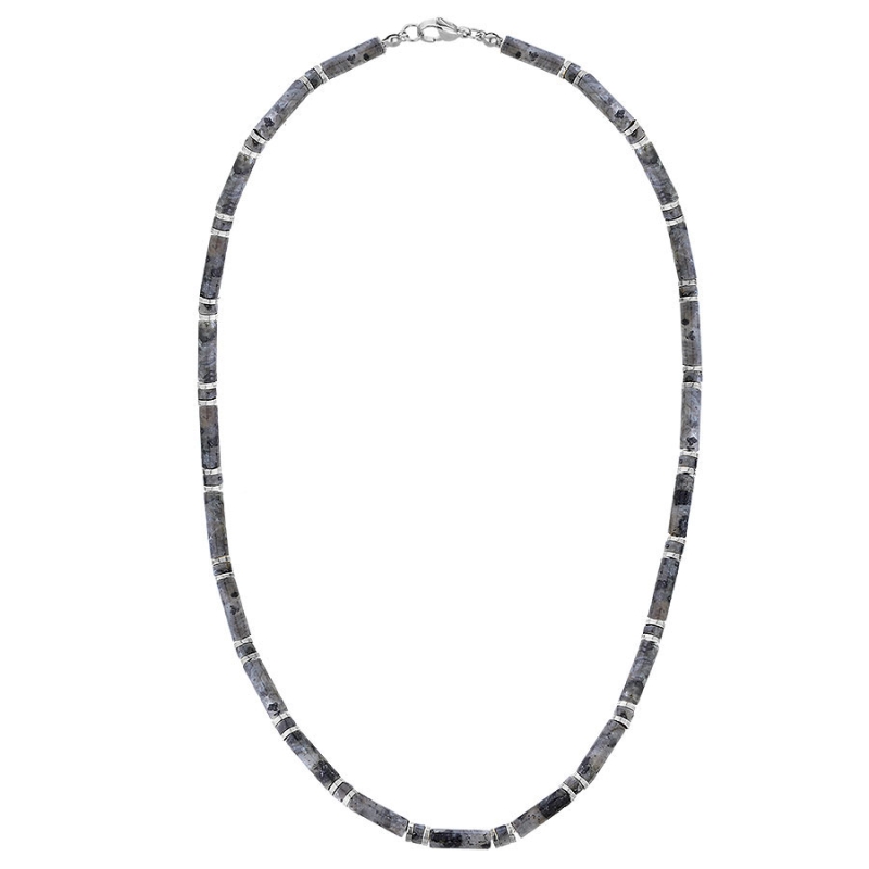 Moderní pánský náhrdelník z larvikitu a stříbrných hematitů zaujme na první pohled svým jedinečným charakterem. Válcovité korálky s přírodní kresbou šedého kamene doplňují jemné prstence z hematitu, které celku dodávají elegantní rytmus i kovový lesk. Tato kombinace barev a textur vytváří harmonický šperk s přirozenou osobností.Náhrdelník působí výjimečně vyváženě – je dostatečně výrazný, aby zaujal, a přitom zůstává decentní, takže se snadno kombinuje s každodenním i formálnějším oblečením. Díky neutrálním tónům se skvěle hodí ke světlým i tmavým barvám. Může být nošen samostatně, nebo jako součást vrstveného stylingu s dalšími šperky.Přírodní larvikit je oblíbený kámen mezi těmi, kteří hledají vnitřní klid, podporu při duševní práci nebo hlubší vhled do vlastních emocí. Spolu s hematitem tvoří vysoce stylový i symbolicky hodnotný šperk. Tento typ minerálního náhrdelníku je aktuálně velmi trendový – skutečný must have sezóny. 💡 Tip: Noste k bílému tričku, černé košili nebo ležérnímu saku – náhrdelník přirozeně podtrhne celý outfit a dodá mu osobitý nádech. K tomuto náhrdelníku si můžete pořídit i ladící náramek a vytvořit tak dokonale sladěný a stylový look. Náramek zakoupíte ZDE.
