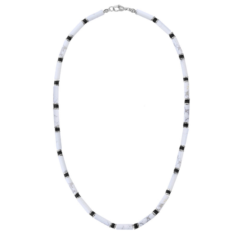 Tento stylový pánský náhrdelník je vyroben z kombinace přírodních minerálů, které zaujmou na první pohled. Dominantní bílý howlit je doplněn kontrastními korálky z černého onyxu a elegantního stříbrného hematitu, které společně vytvářejí moderní, přesto nadčasový vzhled. Díky délce 45 cm sedí příjemně kolem krku a lze jej nosit samostatně nebo vrstvit s dalšími šperky. Každý minerál má nejen estetickou, ale i symbolickou hodnotu. Bílý howlit je známý svou jemnou kresbou a schopností přinášet klid, zatímco černý onyx dodává vnitřní sílu a stabilitu. Stříbrný hematit vnáší do designu špetku lesku a zároveň podtrhuje mužský charakter šperku. Zapínání je vyrobeno z kvalitní chirurgické oceli pro maximální komfort i odolnost. Náhrdelník se skvěle hodí k ležérní košili, tričku i k vrstveným outfitům. Je ideální volbou pro muže, kteří si potrpí na detail, čistotu provedení a jemnou symboliku v každodenních doplňcích. Skvěle doplní letní i městský styl a lze jej kombinovat s náramky ze stejné kolekce. 💡 Tip: Vyzkoušejte tento náhrdelník v kombinaci s jednoduchým černým tričkem a koženým náramkem – výsledkem bude moderní a velmi mužný vzhled, který zaujme při každé příležitosti.