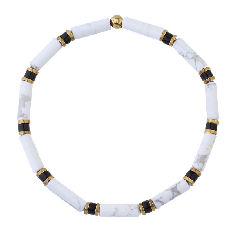 Tento pánský náramek spojuje tři výrazné minerály – bílý howlit, černý onyx a zlatý hematit – do harmonického celku, který vyzařuje klid, sílu a noblesu. Barevná kombinace bílé, černé a zlaté je nadčasová, elegantní a mimořádně stylová. Výsledný vzhled působí vyváženě a přitom mužně.Bílý howlit symbolizuje vnitřní rovnováhu a klid, černý onyx dodává sebedůvěru a stabilitu a zlatý hematit podtrhuje luxusní charakter celého šperku. Každý detail je pečlivě promyšlený – korálky mají menší průměr, takže náramek nepůsobí masivně, ale elegantně a uhlazeně.Tento náramek je určen pro moderního gentlemana, který ví, že skutečný styl se skrývá v detailech. Skvěle doplní outfit do práce, na večerní akci i jako každodenní doplněk pro muže, který dbá na eleganci a charakter. 💡 Tip: Noste ho samostatně nebo ho kombinujte s jednoduchým černým koženým náramkem pro sofistikovaný vrstvený efekt. K tomuto korálkovému náramku si můžete pořídit i ladící náhrdelník a vytvořit tak dokonale sladěný a stylový look. Náhrdelník zakoupíte ZDE