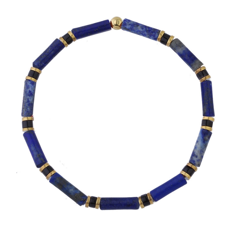 Tento pánský náramek z přírodních kamenů je výrazným módním doplňkem, který spojuje eleganci s hlubší symbolikou. Dominantou jsou podlouhlé korálky ze sodalitu v sytě modrých tónech s jemnými žilkami, které navozují dojem klidu a vyrovnanosti. Sodalit je kamenem rozvahy, vnitřního klidu a logického myšlení.Celkový dojem umocňuje kontrastní černý onyx, jenž náramku dodává hloubku a mužný charakter. Onyx je známý svou ochranou silou, podporou sebevědomí a schopností čelit výzvám. Elegantní zlaté mezikousky z hematitu pak završují celý design nejen vizuálně, ale i energeticky – hematit je kámen stability, odvahy a vnitřní síly.Náramek je navlečený na pevném elastickém lanku, díky čemuž je pohodlný při nošení a snadno se přizpůsobí různým typům zápěstí. Vynikne samostatně i v kombinaci s dalšími minerálními náramky a skvěle doplní jak volnočasový, tak formální outfit. 💡 Tip: Pokud hledáte dárek pro partnera, kamaráda nebo otce, tento náramek je výbornou volbou – spojuje design s významem. K tomuto korálkovému náramku si můžete pořídit i ladící náhrdelník a vytvořit tak dokonale sladěný a stylový look. Náhrdelník zakoupíte ZDE