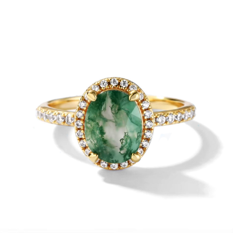Tento luxusní pozlacený prsten s mechovým achátem a zirkony zaujme na první pohled svou elegancí a originalitou. Oválný přírodní kámen uprostřed připomíná zasněženou lesní krajinu, kterou v sobě achát přirozeně kreslí, a dodává každému šperku jedinečný charakter. Po obvodu je kámen lemován drobnými třpytivými zirkony, které celkový dojem ještě více umocňují.Prsten je vyroben ze stříbra a potažen vrstvou kvalitního zlacení, které mu dodává teplý, sofistikovaný lesk. Díky svému designu se hodí jak k běžnému nošení, tak i ke slavnostním příležitostem. Elegantní tvar prstenu se dobře kombinuje s dalšími šperky.Mechový achát je známý svou jemnou kresbou připomínající mechy, větvičky a přírodní struktury. Každý kámen je originál a vnáší do prstenu nádech přírody i hlubší symboliku – je vnímán jako kámen harmonie, uzemnění a rovnováhy. Pokud hledáte šperk, který zaujme a zároveň má příběh, právě jste ho našli. 💡Tip: Tento prsten je výborným dárkem pro ženu, která miluje výjimečné šperky s příběhem. Ať už hledáte dárek k narozeninám, výročí nebo jen tak z lásky, díky své eleganci a významu potěší i ty nejnáročnější. Každý kus je originál – stejně jako osoba, které ho darujete.
