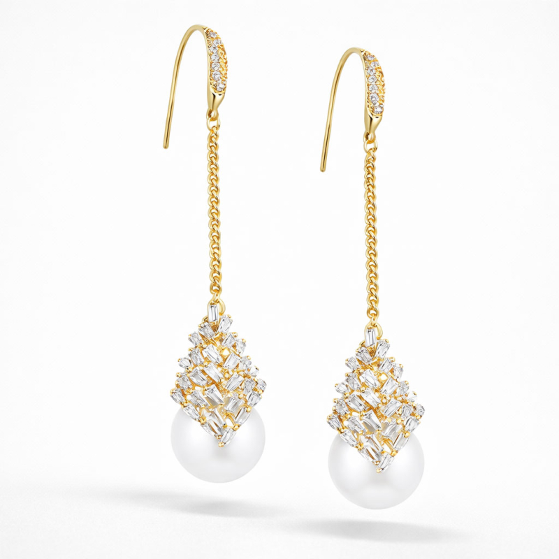 Tyto luxusní visací náušnice v sobě spojují jemnou eleganci perly s moderním geometrickým akcentem tvořeným třpytivými zirkony. Zlatý řetízek dodává šperku lehkost a pohyb, zatímco precizně zasazené zirkony vytvářejí strukturovaný, téměř architektonický detail, který plynule přechází do hladké, kulaté perly. Celek působí vyváženě, sofistikovaně a mimořádně ženským dojmem.Kontrast mezi leskem zirkonů a hebkou strukturou perly vytváří harmonii, která zaujme na první pohled. Náušnice působí luxusně, ale zároveň lehce a přirozeně. Při pohybu se jemně houpou a odrážejí světlo, čímž dodávají celkovému vzhledu živost a elegantní dynamiku.Jsou ideální volbou pro ženy, které hledají výrazný, ale stále vkusný šperk. Skvěle doplní večerní outfit, slavnostní příležitosti i elegantní denní styl, kdy chcete dodat svému vzhledu jemný, ale nepřehlédnutelný detail. 💡 Tip: Ideální k vyčesaným vlasům - dlouhá linie náušnic opticky prodlužuje krk a zvýrazňuje profil. Nejlépe vynikne s drdolem nebo culíkem.