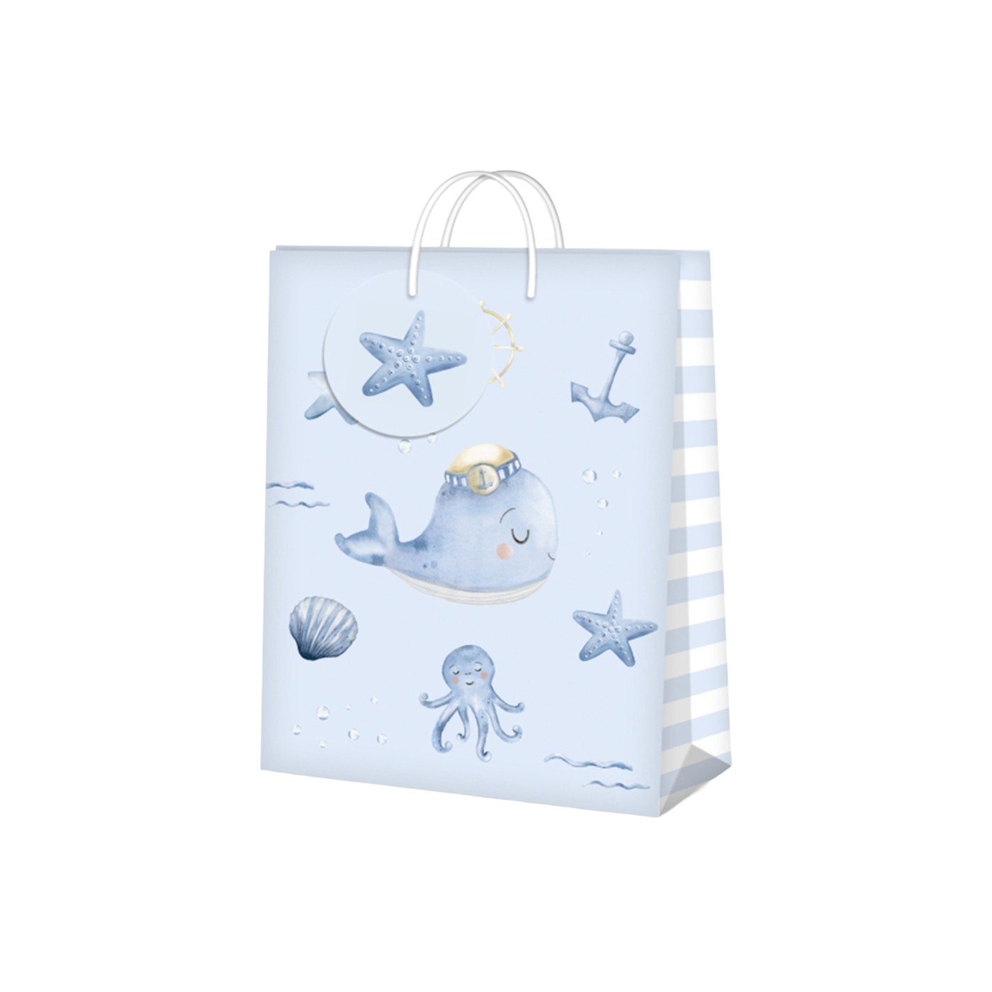 Modrá papírová dárková taška s dětským motivem velryby. Rozměry: 17,8 × 9,8 × 22,9 cm (šířka × hloubka × výška)