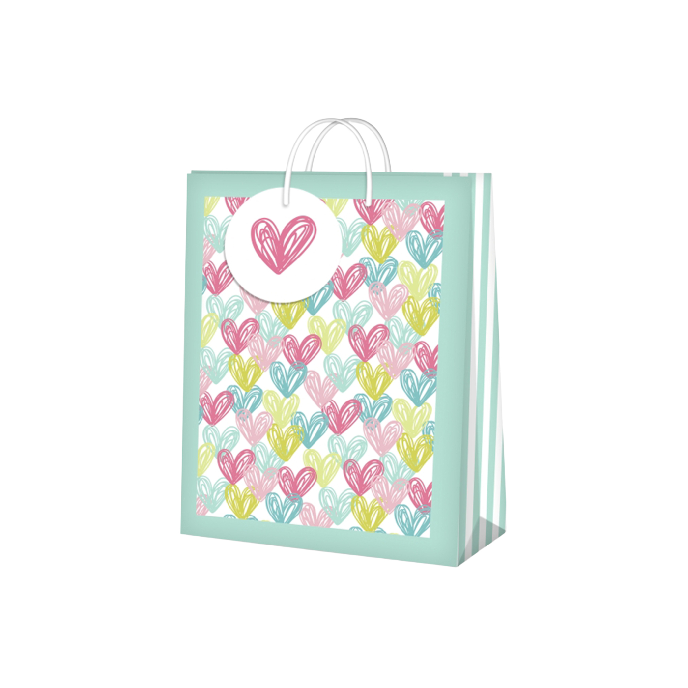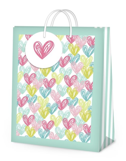 Papírová dárková taška s univerzálním motivem srdíček v pastelových barvách. Rozměry: 17,8 × 9,8 × 22,9 cm (šířka × hloubka × výška)