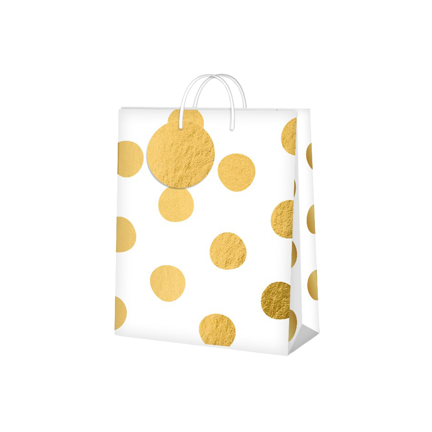 Bílá papírová dárková taška s velkými zlatými puntíky. Rozměry: 17,8 × 9,8 × 22,9 cm