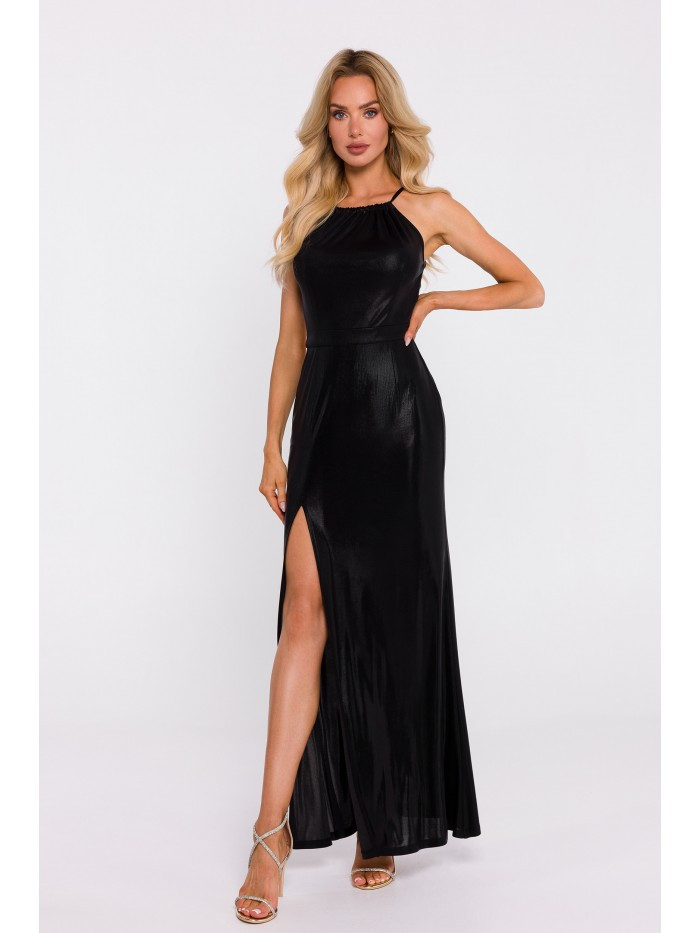 M833 Metalické maxi šaty se zavazováním za krkem - černé EU XL