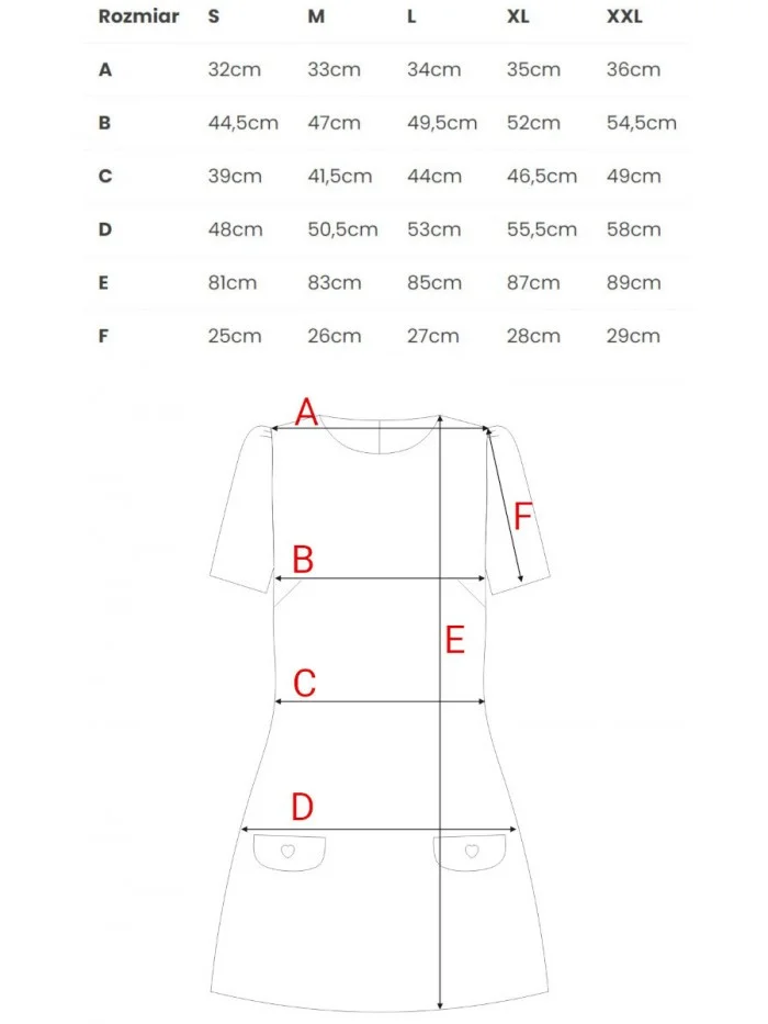 70 % polyester 27 % rayon 3 % spandex INFORMACE O PRODUKTU: tkaná látka mini trapézové šaty krátké obláčkové rukávy ozdobné klopy vpředu s knoflíky ve tvaru srdce skrytý zadní zip bez podšívky naše modelka je vysoká 171 cm a nosí velikost S navrženo a vyrobeno v Polsku VELIKOSTSMLXLXXLA32 cm33cm34cm35cm36cmB44,5cm47cm49,5cm52cm54,5cmC39cm41,5cm44cm46,5cm49cmD48cm50,5cm53cm55,5cm58cmE81cm83cm85cm87cm89cmF25cm26cm27cm28cm29cm