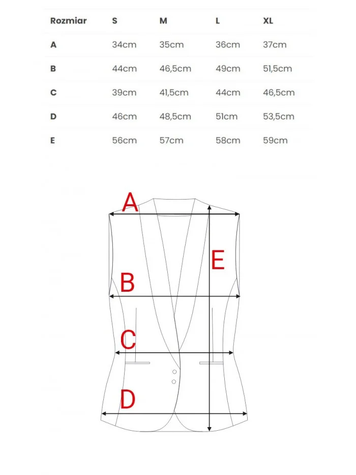 76% bavlna 21% polyester 3% elastan Podšívka: 60% viskóza 35% polyester 5% elastan MATERIÁL Materiál: tkanina na bázi bavlny, matný povrch PODROBNOSTI O PRODUKTU Výstřih: hluboký výstřih do V Límec: šálový límec Zapínání: tři látkové knoflíky Kapsy: dvě přední kapsy Model: M859 Navrženo a vyrobeno v Polsku Modelka na fotografii měří 171 cm a má na sobě velikost S STŘIH A VÝSTŘIH Střih: na míru Tvar: mírně vypasovaný Délka: standardní, do pasuVELIKOSTSMLXLA34 cm35cm36cm37cmB44cm46,5cm49cm51,5cmC39cm41,5cm44cm46,5cmD46cm48,5cm51cm53,5cmE56cm57cm58cm59cm