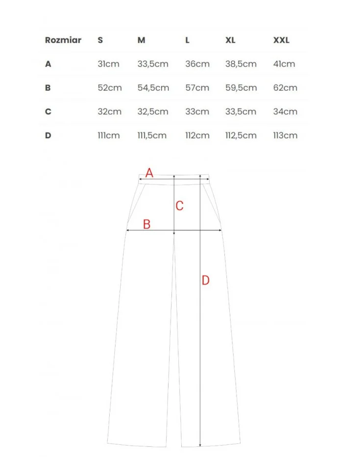 95% polyester 5% elastan MATERIÁL Materiál: lehká strukturovaná tkanina (krep), matný povrch PODROBNOSTI O PRODUKTU Pas: vysoký, elastický pás Zapínání: nazouvací (bez zipu) Kapsy: žádné Model: M862 Navrženo a vyrobeno v Polsku Modelka na fotografii měří 171 cm a má na sobě velikost S STŘIH A VÝSTŘIH Střih: volný Tvar: široké kalhoty Délka: po celé délceVELIKOSTSMLXLXXLA31cm33,5cm36cm38,5cm41cmB52cm54,5cm57cm59,5cm62cmC32cm32,5cm33cm33,5cm34cmD111cm111,5cm112cm112,5cm113cm