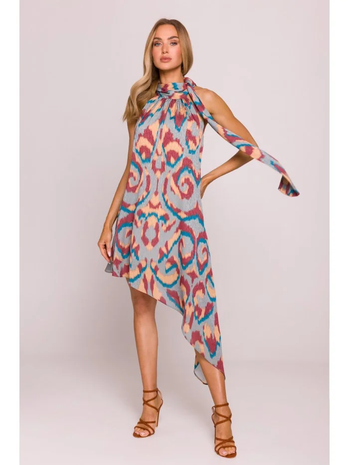 Hlavní tkanina: 100% polyester Podšívka: 95% polyester 5% elastan MATERIÁL Materiál: lehká, vzdušná žakárová tkanina s tištěným vzorem PODROBNOSTI O PRODUKTU Výstřih: výstřih s vysokým límcem a zavazováním Rukávy: bez rukávů Zapínání: zavazování za krkem Kapsy: žádné Vzor: pestrobarevný Podšívka: s podšívkou Model: M867 Navrženo a vyrobeno v Polsku Modelka na fotografii měří 171 cm a má na sobě velikost S STŘIH A VÝSTŘIH Střih: volný, uvolněný střih s otevřenými zády a elastickým detailem na zádech Tvar: trapézová silueta s asymetrickým lemem Délka: krátká - nad kolena, na jedné straně sahající ke kotníkůmVELIKOSTS/ML/XL2XL/3XLA43cm48cm53cmB86cm89cm92cmC106cm107cm108cm