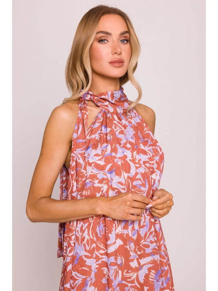 Hlavní tkanina: 100% polyester Podšívka: 95% polyester 5% elastan MATERIÁL Materiál: lehká, vzdušná žakárová tkanina s tištěným vzorem PODROBNOSTI O PRODUKTU Výstřih: výstřih s vysokým límcem a zavazováním Rukávy: bez rukávů Zapínání: zavazování za krkem Kapsy: žádné Vzor: pestrobarevný Podšívka: s podšívkou Model: M867 Navrženo a vyrobeno v Polsku Modelka na fotografii měří 171 cm a má na sobě velikost S STŘIH A VÝSTŘIH Střih: volný, uvolněný střih s otevřenými zády a elastickým detailem na zádech Tvar: trapézová silueta s asymetrickým lemem Délka: krátká - nad kolena, na jedné straně sahající ke kotníkůmVELIKOSTS/ML/XL2XL/3XLA43cm48cm53cmB86cm89cm92cmC106cm107cm108cm