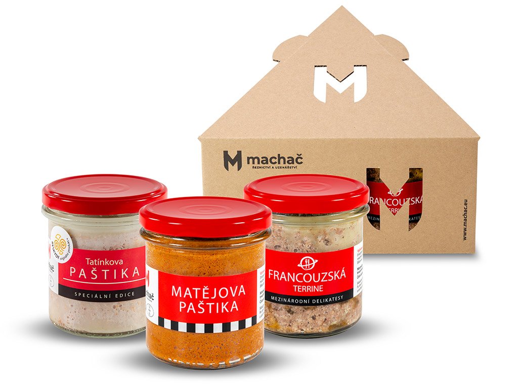 Kvalitní jedlý dárek pro náročné gurmány, to je trojice poctivých delikatesních paštik ve skle. Tatínkova paštika, Matějova paštika a Francouzská terrine od Machače v elegantní dárkové krabici. Vyrobeno bez chemických přísad. Machač je rodinné řeznictví a uzenářství z Mořkova. Všechny výrobky jsou vyráběny z lokálních surovin. Tatínkova paštika Poctivá paštika z pečeného vepřového masa a jater, dle originálního receptu zakladatele firmy Machač. Z kvalitních surovin. Skvělá s čerstvým pečivem a chilliádou. Složení: vepřové maso 75 % (vepřový lalok), vepřová játra 10 %, voda, sůl, koření. Výživové údaje na 100 g výrobku: Energetická hodnota: 1358 kJ/328 kcal; Tuky: 28,5 g, z toho nasycené mastné kyseliny 10,6 g; Sacharidy: 3,2 g, z toho cukry 0 g; Bílkoviny: 14,7 g; Sůl: 1,6 g Obsah: 250 g Matějova paštika Pikantní retro paštika se zeleninou a kořením. Skvělá je na topinkách nebo čerstvém pečivu. Poctivá chuť bez chemie. Složení: vepřové maso 56 %, směs zeleniny 38 %, sůl, hořčice, směs koření, sušená vejce Výživové údaje na 100 g: Energetická hodnota: 735 kJ/176 kcal / Tuky: 11,4 g, z toho nasycené mastné kyseliny: 4,4 g / Sacharidy: 4,5 g, z toho cukry: 1,6 g / Bílkoviny: 14,1 g / Sůl: 1,5 g Obsah: 280 g Francouzská terrine Zažijte Francii na vašem stole. Ikonická paštika z hrubě mletého pečeného vepřového masa a jater. Trvanlivý výrobek bez chemických přísad. Složení: vepřové maso 40 %, vepřová játra 30 %, vepřové sádlo, vepřový vývar, sůl, bramborový škrob, směs koření, cibule, cukr Výživové údaje na 100 g výrobku: Energetická hodnota: 1594 kJ/385 kcal / Tuky: 33,9 g, z toho nasycené mastné kyseliny: 12,7 g / Sacharidy: 7,3 g, z toho cukry: 0,4 g / Bílkoviny: 12,7 g / Sůl: 2,1 g Obsah: 280 g