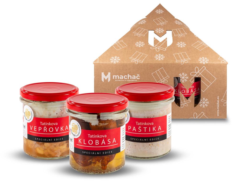 Kvalitní jedlý dárek pro Vaše blízké, to je trojice poctivých masových zavařenin ve skle. Tatínkova paštika, Tatínkova vepřovka a Tatínkova klobása v elegantní dárkové krabici. Aktuálně skladem Vánoční balení - motiv bílých vloček na obalu. Vyrobeno bez chemických přísad. Machač je rodinné řeznictví a uzenářství z Mořkova. Všechny výrobky jsou vyráběny z lokálních surovin. Tatínkova paštika Poctivá paštika z pečeného vepřového masa a jater, dle originálního receptu zakladatele firmy Machač. Z kvalitních surovin. Skvělá s čerstvým pečivem a chilliádou. Složení: vepřové maso 75 % (vepřový lalok), vepřová játra 10 %, voda, sůl, koření. Výživové údaje na 100 g výrobku: Energetická hodnota: 1358 kJ/328 kcal; Tuky: 28,5 g, z toho nasycené mastné kyseliny 10,6 g; Sacharidy: 3,2 g, z toho cukry 0 g; Bílkoviny: 14,7 g; Sůl: 1,6 g Obsah: 250 g Tatínkova vepřovka Praktická masová zavařenina z vepřového masa ve vlastní šťávě. Vždy po ruce k použití za tepla i za studena. Skvělý základ pro rychlý a dobrý oběd doma i na cestách. Složení: vepřové maso 93 %, voda, vepřové kůže, sůl, koření. Výživové údaje na 100 g výrobku: Energetická hodnota: 968 kJ/233 kcal; Tuky: 18,7 g, z toho nasycené mastné kyseliny 7,3 g; Sacharidy: 0,8 g, z toho cukry 0 g; Bílkoviny: 15,4 g; Sůl: 1,9 g Obsah: 300 g Tatínkova klobása Poctivá Machačova valašská klobása zavařená ve slaném nálevu. Vyrobeno podle původní receptury prověřené léty. Složení: vepřové maso 80 %, hovězí maso 10 %, nálev (voda, sůl), sůl, koření, jedlé vepřové střívko. Výživové údaje na 100 g výrobku: Energetická hodnota: 1060 kJ/256 kcal; Tuky: 20,9 g, z toho nasycené mastné kyseliny 8 g; Sacharidy: 0,6 g, z toho cukry 0 g; Bílkoviny: 16,2 g; Sůl: 2,2 g Obsah: čistá hmotnost výrobku po odkapání 180 g