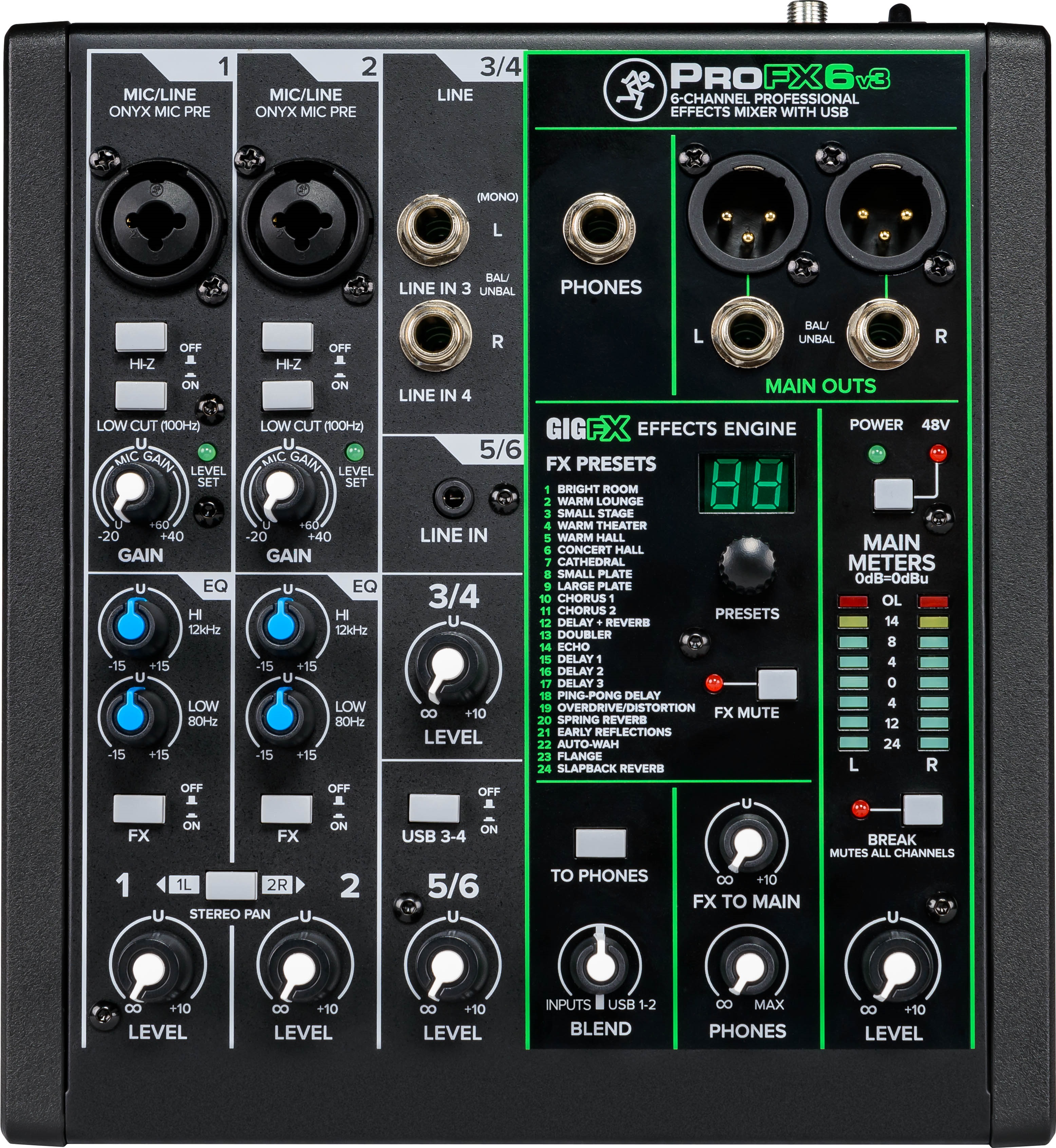 Analogový mixážní pult Nová série mixážních pultů ProFXv3 od renomovaného výrobce Mackie přináší mnoho nových funkcí a vylepšených vlastností. Tyto pulty jsou vybaveny novými preampy, které zajišťují skvělou zvukovou kvalitu, a větším počtem efektů GigFX pro koncertní mixování. Součástí balení je kromě softwaru Tracktion i ProTools a zvukový záznam dosahuje kvality až 192 kHz/24 bit. Preampy Onyx jsou vyvinuté speciální pro koncertní zvučení. Disponují prakticky nulovým šumem, stabilizací feedbacku a optima