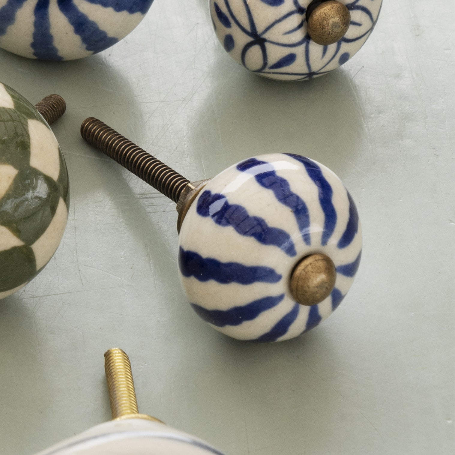 MADAM STOLTZ Kameninová úchytka Brown / Blue Antique Brass modrá, měděná barva, kov, keramika. Keramická úchytka s ručně malovaným dekorem dodá vašemu nábytku výrazný akcent. Je vyrobena z kvalitní kameniny a kovu s mosaznou úpravou a její tóny krásně vyniknou jak v přírodním, tak i moderním interiéru.