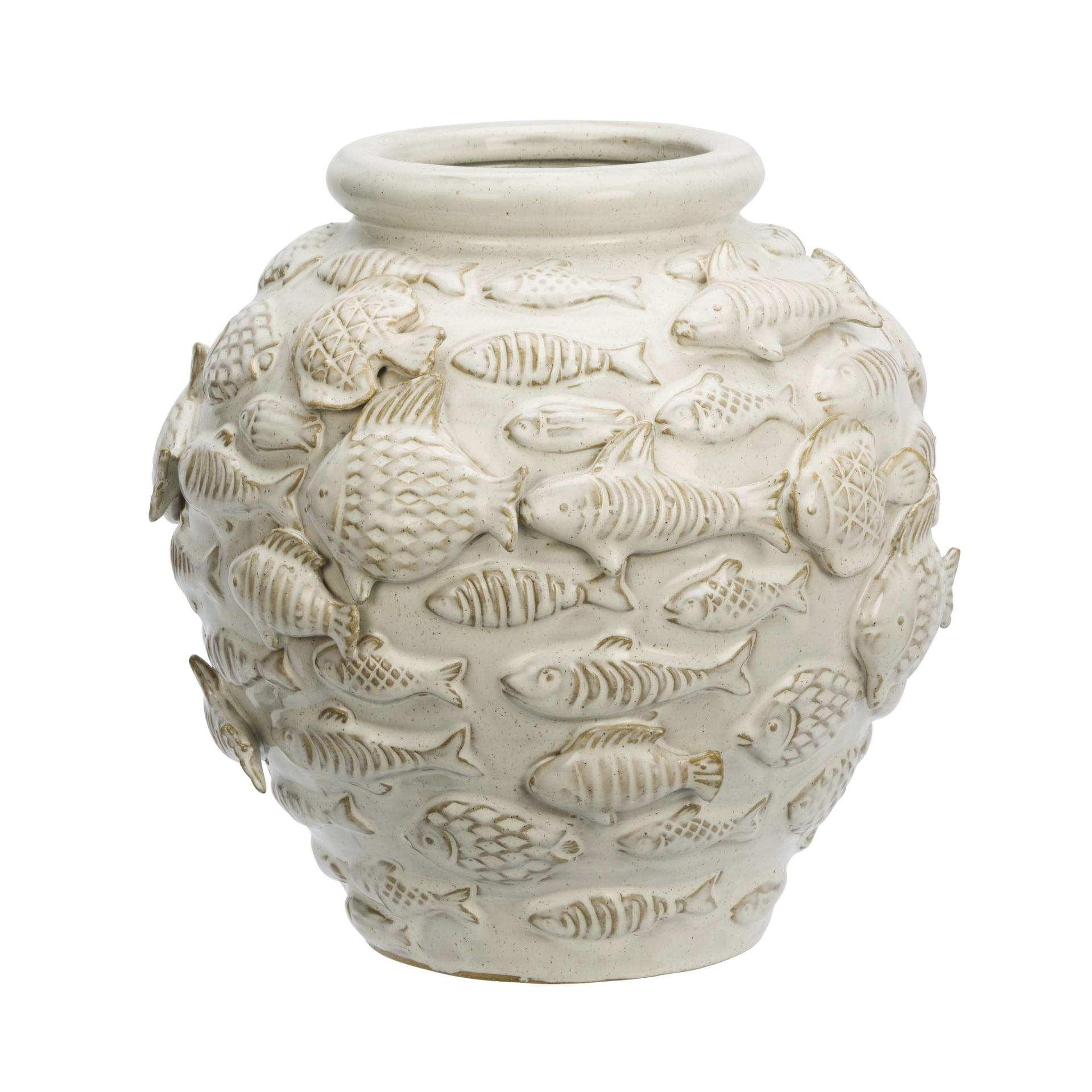 MADAM STOLTZ Kameninová váza Fishes Off White 27 cm, krémová barva, keramika. Tato velká kameninová váza od dánské značky Madam Stoltz okamžitě přitáhne pozornost. Její povrch je zdobený vystupujícími rybkami, které jako by klouzaly po povrchu - jejich seskupení připomíná malou akvarijní scénu, kde si hejno ryb pomalu plave prostorem.