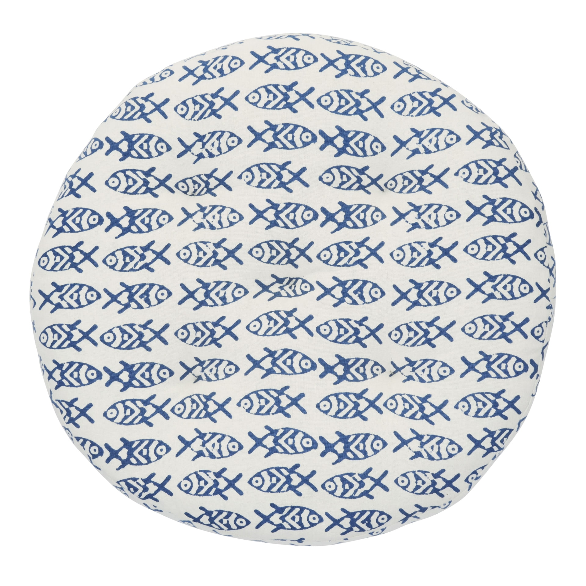 MADAM STOLTZ Kulatý podsedák Fishes Blue Ø 45 cm, modrá barva, textil. Kulatý bavlněný podsedák na židli pro vaše každodenní pohodlné posezení s hravým potiskem inspirovaným mořem.