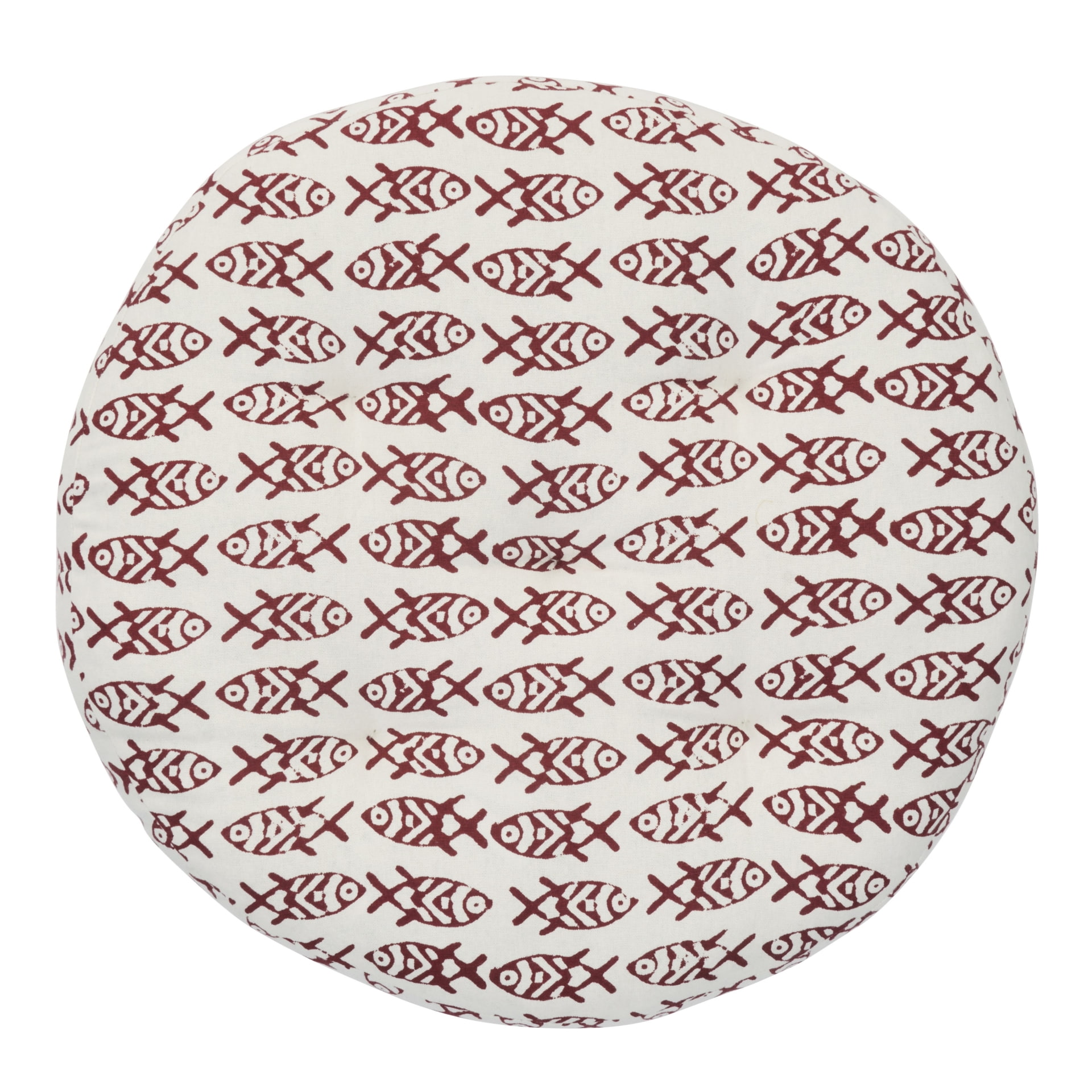 MADAM STOLTZ Kulatý sedák na židli Fish Ø 45 cm, červená barva, textil. Tento kulatý sedák na židli od Madam Stoltz vnese do vašeho interiéru i na terasu hravost, barvu a lehký nádech prázdninové pohody. Jemný krémový podklad s motivem vínových rybek působí originálně a svěže a krásně oživí jídelní židli, pracovní kout, čtecí křeslo i letní posezení venku. Skvěle zapadne do boho i přírodně laděného interiéru.