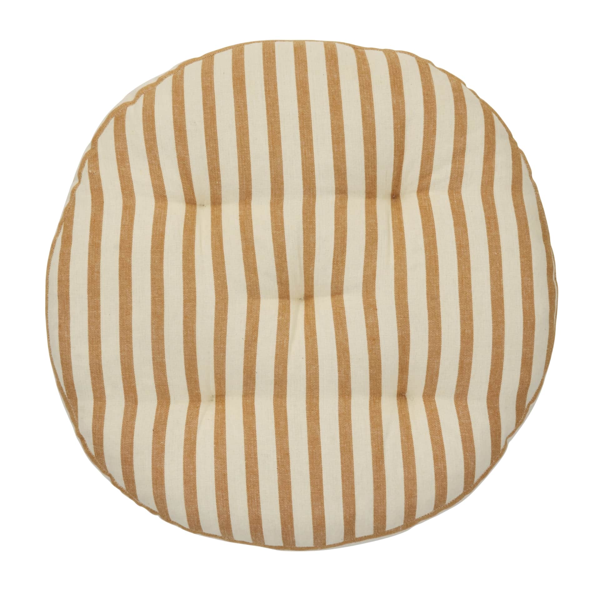 MADAM STOLTZ Kulatý sedák na židli Stripes Off white / Dark honey Ø 45 cm, hnědá barva, textil. Tento kulatý sedák na židli Madam Stoltz v tónech vnese do vašeho domova i na terasu harmonický pocit plný klidu a pohody. Jemný pruhovaný vzor působí nadčasově a snadno ho sladíte s dřevěným nábytkem, přírodními textiliemi.