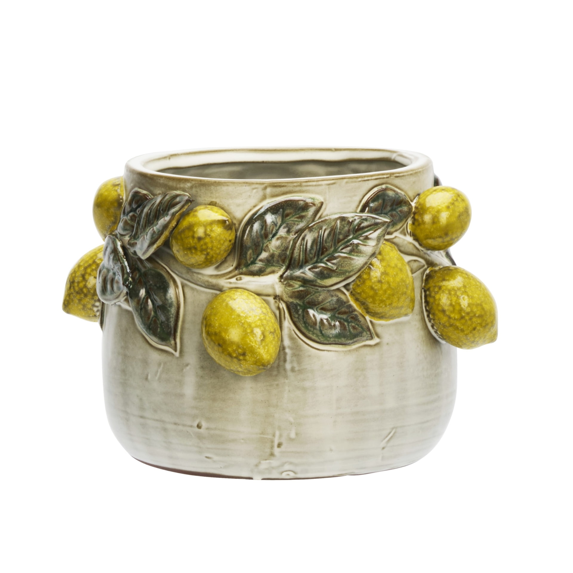 MADAM STOLTZ Obal na květiny Lemons Off White Ø 18 cm, žlutá barva, keramika. Kameninový květináč se středomořským šarmem od značky Madam Stoltz vnese do interiéru veselý prvek, který rozzáří každý den. Obal zdobí reliéfní detaily a trojrozměrný motiv citronů. Jeho hravý design vytvoří útulnou domácí atmosféru jako v malebných vesničkách u moře.