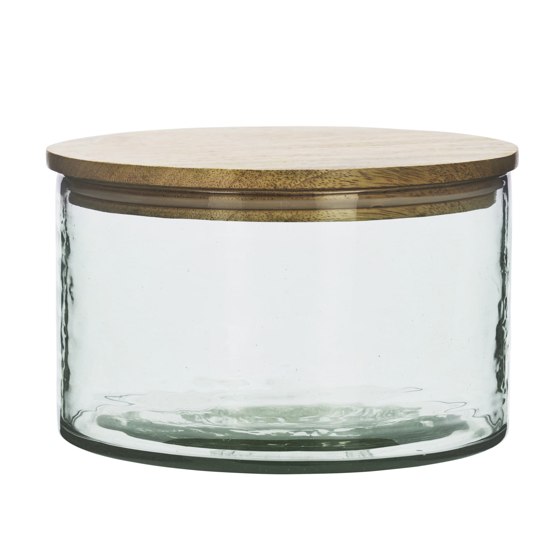 Díky kvalitní kombinaci materiálů je dóza nejen praktickým, ale také designovým doplňkem. průměr 20 cm / výška 13 cm Částečně recyklované sklo, mangové dřevo.