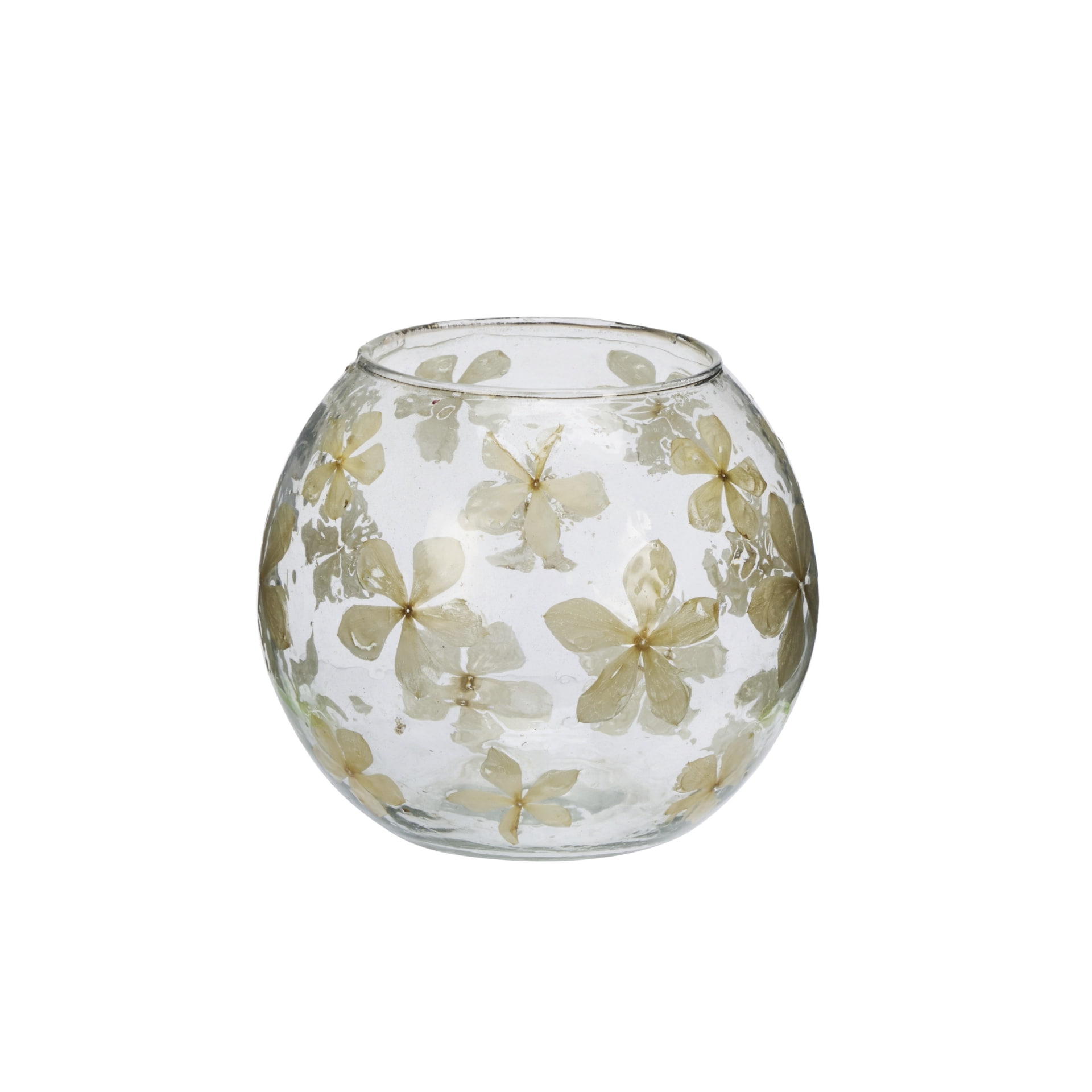 Je vyrobená z částečně recyklovaného skla, díky němuž je každý kus unikátní. Transparentní sklo jemně rozptyluje světlo kolem lisovaných květů a zdůrazňuje jejich detaily – každý lístek a stonek je viditelný a přirozeně odlišný.