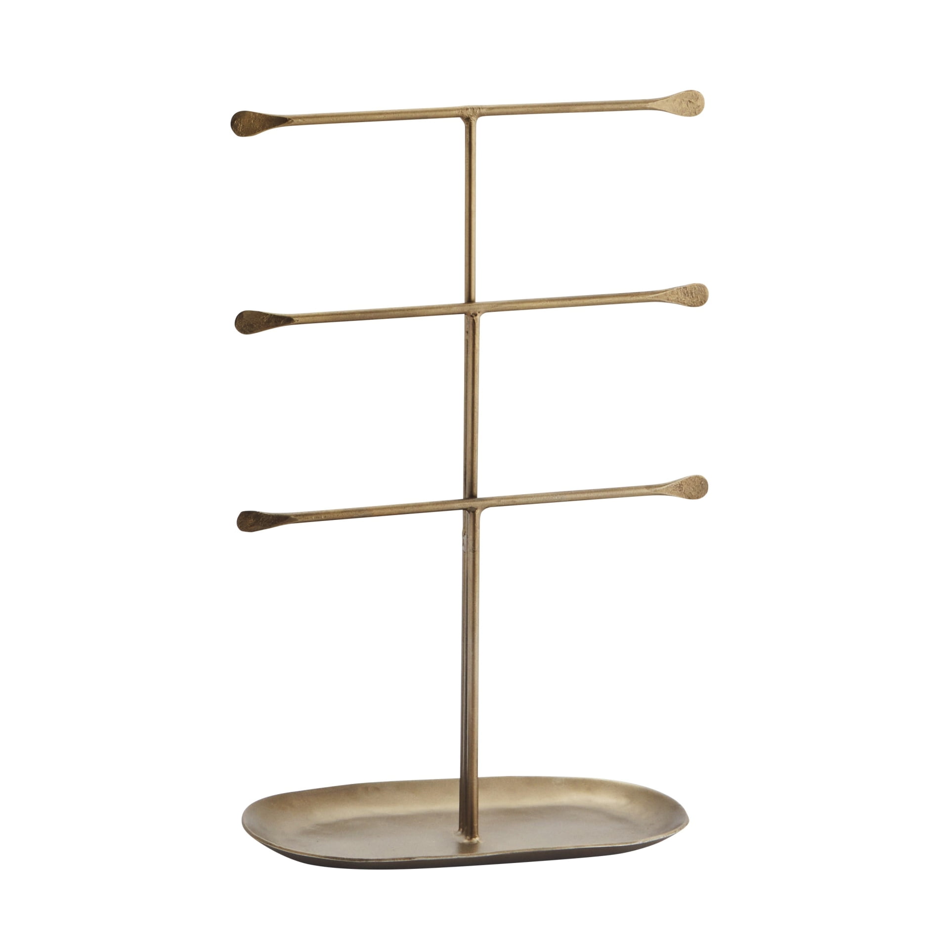 MADAM STOLTZ Stojánek na šperky s miskou Antique Brass, zlatá barva, kov. Své náušnice, prstýnky, řetízky a náramky si vystavte s veškerou elegancí, která k nim patří. Kovový stojánek na šperky od dánské značky Madam Stoltz splní svou praktickou úlohu a zároveň bude stylovým doplňkem nočního stolku i poličky v koupelně. Spodní část navíc zdobí miska, na kterou můžete vystavit oblíbený parfém, nebo uložit hodinky.