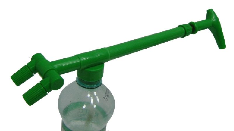 Velmi účinný dvojčinný postřikovač, se dvěma regulovatelnými tryskami. Jako zásobník kapaliny lze použít běžnou PET láhev. Trysky postřikovače lze seřídit od jemného mlžení, do prudkého produ kapaliny. Postřikovač stříká vytahováním i stlačováním ovládací paáky pumpy. Láhev není pod stálým tlakem, nýbrž rozstřik kapaliny zajišťuje přímá dvojčinná pumpa.