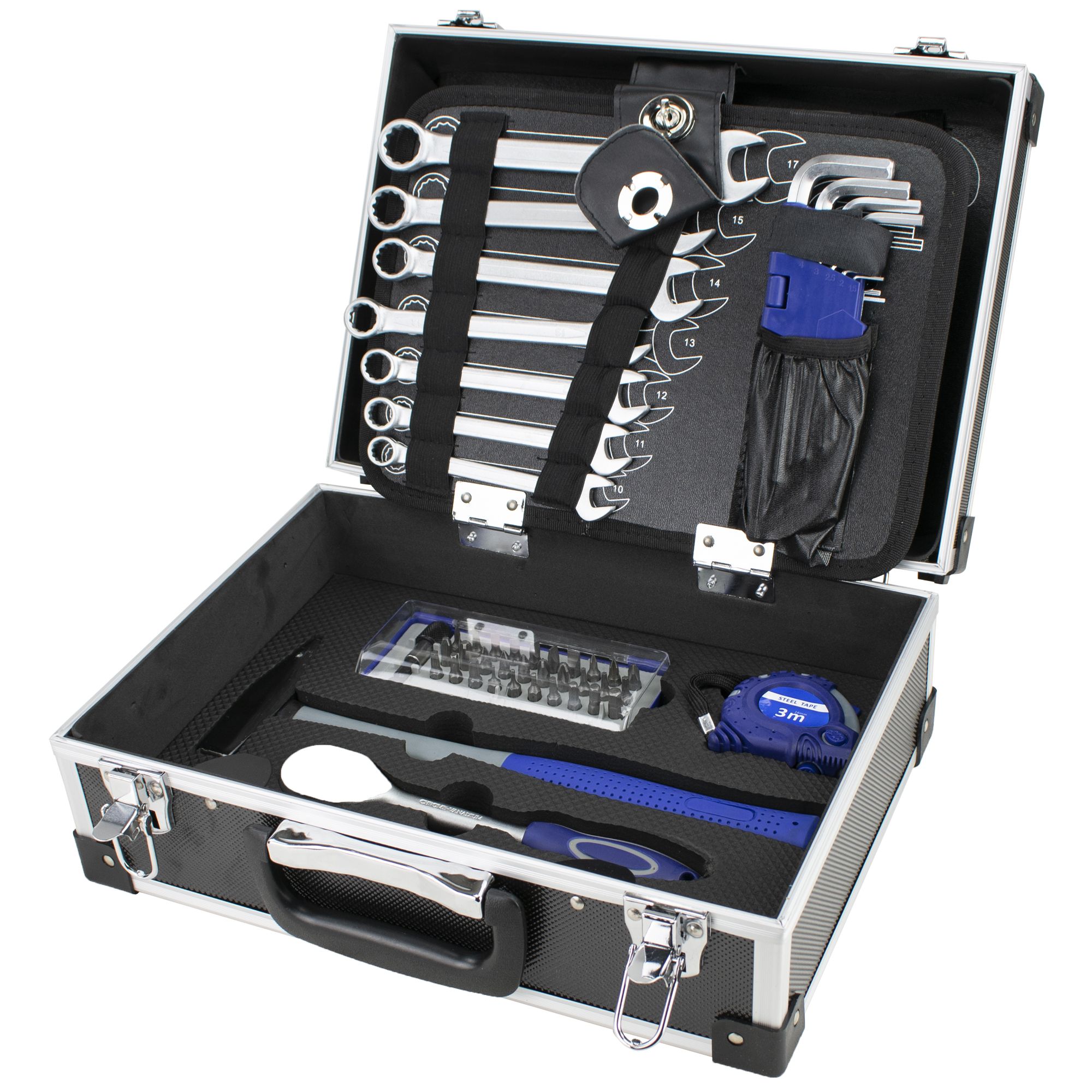 Praktická sada nářadí pro běžné domácí opravy a práce. Sada obsahuje nejpoužívanější nářadí pro běžnou práci jako jsou šroubováky, kleště, metr a jiné. Celá sada je dodávána v praktickém a odolném hliníkovém kufru. Tento usnadňuje skladování a manipulaci. Počet dílů:73Šroubováky:10 ks + šroubovák na bityKleště:3 ksKlíče:9 ks IMBUS (1,5 - 10 mm), 7 ks očkoploché (10 - 17 mm)Kladivo:300 gGola:1 ks ráčna + 8 ks hlavice (10 - 19 mm) (3/8")Bity:30 ksExtra:svinovací metr, ulamovací nůžKufr:ANO