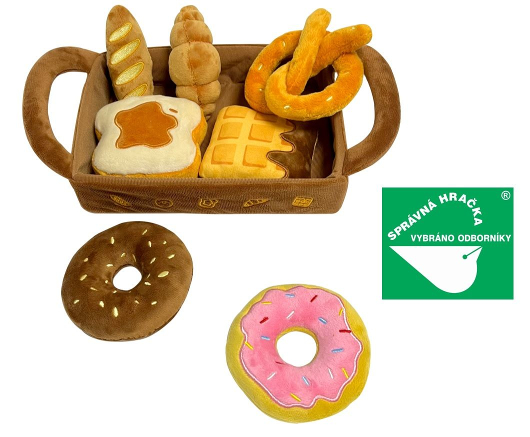 Plyšový košík s pečivem je nezbytným doplňkem při hraní si na pekárnu nebo prodej pečiva v obchodě, ale najde také své využití i v dětské kuchyňce. Vyšívaná tematická plyšová hračka z velmi kvalitní plyše. Sada obsahuje košík a 7 imitací pečiva: slaný rohlík, preclík, croissant, 2x donut, vafli a toast s medem. Použité materiály: Vrchní látka a výplň 100% polyester, vnitřní výztuže košíku - plast. Ruční praní a čištění vlhkým hadříkem.Vhodné pro děti od 2 let.