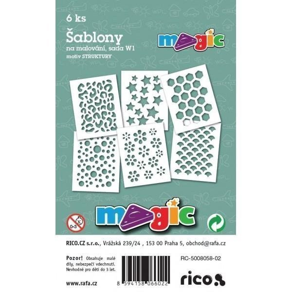 <p>Sada 6ks papírové šablony na malování. Materiál bílý karton 220g. Doporučujeme pro malování s magickými voskovkami (technika frotáž), vhodné i pro tupování s temperami, pro malování s foukacími fixami nebo techniku malování plastelínou. Nevhodné pro děti do 3.let, obsahuje malé dílky. Rozměry 11x14cm.</p>