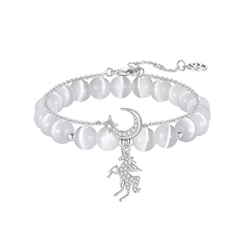 Objevte kouzlo a tajemství v našem exkluzivním setu náramků, které přináší příběh z kouzelného světa plného mystiky a fantazie. Tento set zahrnuje dva náramky, z nichž jeden je jemný s přívěskem měsíce a hvězdičky a druhý korálkový, zdobený kočičím okem a přívěskem bájného jednorožce, oba odrážejí svět, kde se snoubí krása přírody s elementy magie. První náramek, dlouhý 15 cm s 4 cm prodlužovacím řetízkem, je vyroben z jemného řetízku a zdobený přívěskem měsíce, který symbolizuje nekonečné možnosti vesmíru. Tento náramek se nosí volněji, což dodává pocit lehkosti a svobody. Druhý náramek o délce 17,5 cm je sestaven z 8 mm korálků kočičího oka, jenž mění odlesky v závislosti na světle, čímž každý pohled na náramek stává se jedinečným zážitkem. Jeho centrální kus, bájný jednorožec, je symbolem čistoty a síly. Tento set náramků je nejen nádherným módním doplňkem, ale i amuletem, který by mohl přinést ochranu a štěstí svému nositeli. Je ideálním dárkem pro každého, kdo má rád příběhy plné fantazie a kouzla, nebo pro ty, kdo chtějí přidat trochu magie do svého každodenního života. Každý náramek je mistrovským dílem, které slibuje nejen estetickou krásu, ale také hlubší spojení s mystickými silami přírody.