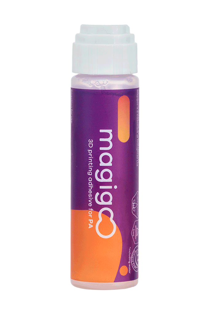 Popis produktu: MAGIGOO Pro PA – Lepicí tyčinka pro přilnavost nylonu (50 ml) MAGIGOO Pro PA je profesionální lepicí tyčinka navržená výhradně pro 3D tisk z nylonových (PA) filamentů. Díky speciální receptuře zajišťuje výbornou přilnavost první vrstvy během tisku a snadné odstranění výtisku po vychladnutí tiskové plochy. Zbytky lepidla lze navíc jednoduše vyčistit vodou. Proč právě MAGIGOO Pro PA? Nylon (polyamid, PA) je skupina polymerů vyznačujících se vysokou pevností, houževnatostí, pružností, odolností vůči opotřebení, chemikáliím a teplu. V praxi se nejčastěji používají typy PA6, PA66 a PA12, často zesílené skelnými nebo uhlíkovými vlákny. I přes výborné mechanické vlastnosti patří nylon mezi nejobtížněji tisknutelné materiály FDM technologií, především kvůli nízké přilnavosti k běžným tiskovým povrchům a vysoké tendenci ke kroucení (warping). MAGIGOO Pro PA byl vyvinut právě k potlačení těchto potíží – zajišťuje stabilní přilnutí při široké škále nylonových filamentů, ať už čistých, nebo modifikovaných (graftované polymery, PA s výztuží atd.). Výhody: Optimalizováno pro PA6, PA66, PA12 a jejich varianty (vč. nylonů s aditivy) Vhodné pro průmyslové použití i náročné prototypy Snadné odstranění modelu po vychladnutí – bez nářadí a bez poškození Vodou omyvatelné zbytky lepidla Vhodné pro použití na skleněné i polymerové tiskové podložky MAGIGOO Pro PA je ideálním řešením pro každého, kdo pracuje s nylonovými materiály a chce zaručit spolehlivou adhezi bez deformací a komplikací. Více o tom, jak a proč využívat adhezivní přípravky najdete v našem blogovém článku.Návod k použití: 1. Odstranění těsnící folie - Před prvním použitím je nutné odstranit kolečko z těsnění, které brání vysychání a rozlití přípravku během přepravy. Odšroubujte kryt aplikátoru a odstraňte těsnicí folii. 2. Aplikace výrobku - Aplikujte na tiskovou podložku souvislý tenký film, který zajistí přilnavost výtisku k podložce. Jakmile je výrobek aplikován, doporučuje se láhev znovu uzavřít tak, aby vnitřní kapalina nevyschla, což by mohlo způsobit zanesení aplikátoru. 3. Tisk modelu - Magigoo lze použít pro 3D tiskárny s vyhřívanou i nevyhřívanou tiskovou podložkou. 4. Sundání modelu z podložky - Při tisku je spojení mezi materiály velmi silné, jakmile dojde k ochlazení na pokojovou teplotu, lze tisk sundat bez použití násilí. 5. Očištění podložky - Při nerovnoměrném rozprostření zbytku přípravku po tisku je vhodné podložku v místě použití otřít vlhkým hadříkem. Pro další tisk pak můžete nanést novou vrstvu a nechat ji zaschnout.
